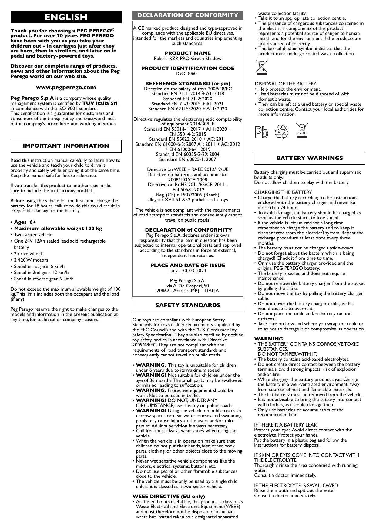 Download the instructions for your TOUT TERRAIN in PDF format for free! Find your manual Polaris RZR PRO Green Shadow - PEG PEREGO and take your electronic device back in hand. On this page are published all the documents necessary for the use of your device. Polaris RZR PRO Green Shadow by PEG PEREGO.