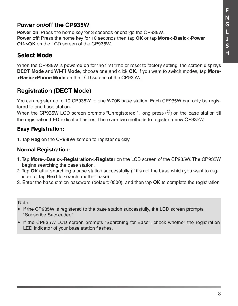 + Ifthe CP935W LCD screen prompts “Searching for Base”, check whether the registration LED indicator of your base station flashes.