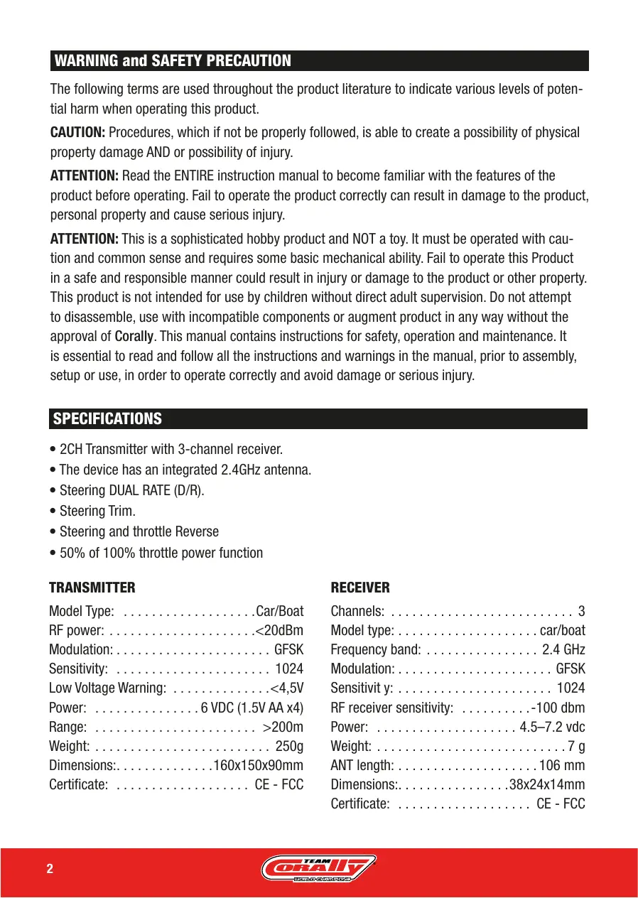 ATTENTION : Il s’agit d’un produit de loisir sophistiqué et NON d'un jouet. Il doit être utilisé avec prudence et bon sens et nécessite des compétences mécaniques de base. Le fait de ne pas utiliser ce produit de manière sûre et responsable peut entraîner des blessures ou des dommages au produit ou à d'autres biens. Ce produit n'est pas destiné à être utilisé par des enfants sans la surveillance directe d’un adulte. N'essayez pas de démonter, d'utiliser des composants incompa- tibles ou d'augmenter le produit de quelque façon que ce soit sans l'approbation de Corally. Ce manuel contient des instructions relatives à la sécurité, au fonctionnement et à l'entretien. Il est essentiel de lire et de suivre toutes les instructions et tous les avertissements contenus dans le manuel, avant l'assemblage, la configuration ou l’utilisation, afin de fonctionner correctement et d'éviter tout dommage ou blessure grave.