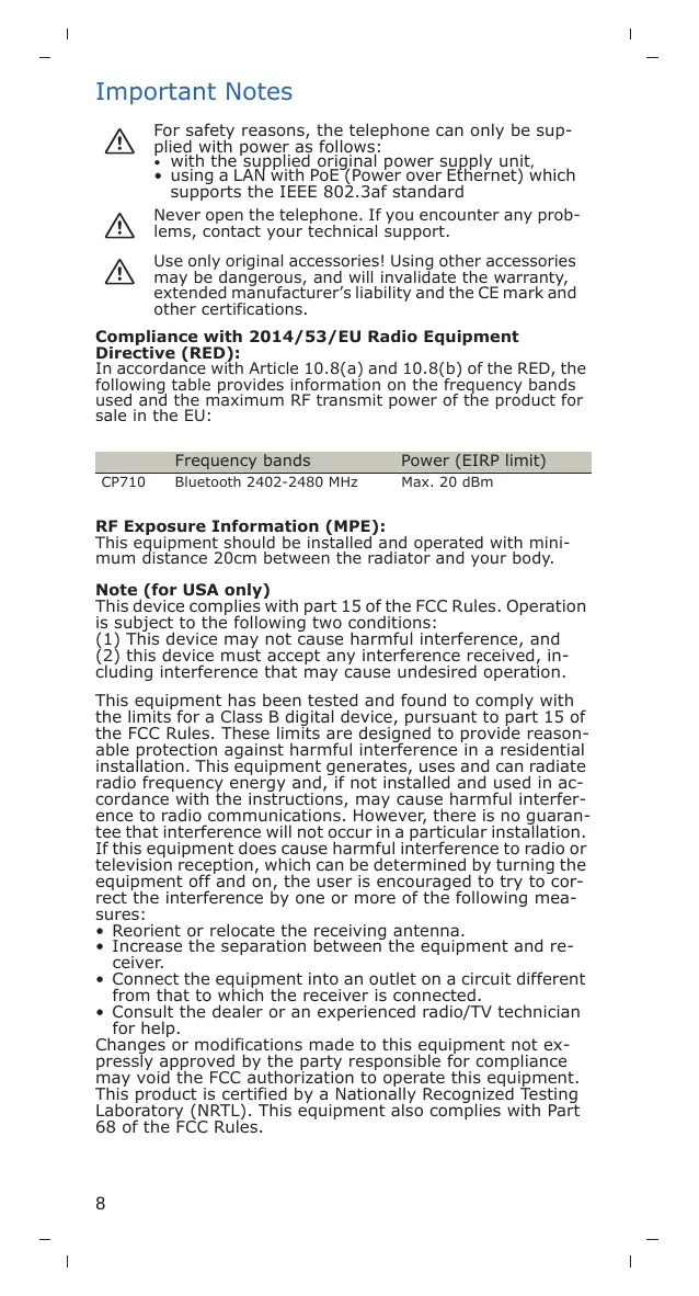 CP710 Bluetooth 2402-2480 MHz Méx. 20 dBm