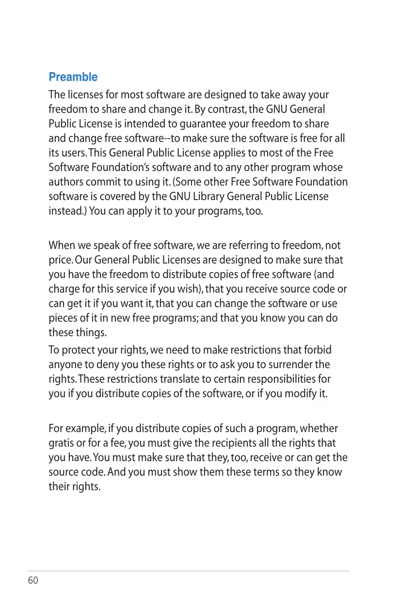 Preamble The licenses for most software are designed to take away your freedom to share and change it. By contrast, the GNU General Public License is intended to guarantee your freedom to share and change free software--to make sure the software is free for all its users. This General Public License applies to most of the Free Software Foundation’s software and to any other program whose authors commit to using it. (Some other Free Software Foundation software is covered by the GNU Library General Public License instead.) You can apply it to your programs, too. When we speak of free software, we are referring to freedom, not price. Our General Public Licenses are designed to make sure that you have the freedom to distribute copies of free software (and charge for this service if you wish), that you receive source code or can get it if you want it, that you can change the software or use pieces of it in new free programs; and that you know you can do these things. To protect your rights, we need to make restrictions that forbid anyone to deny you these rights or to ask you to surrender the rights. These restrictions translate to certain responsibilities for you if you distribute copies of the software, or if you modify it. For example, if you distribute copies of such a program, whether gratis or for a fee, you must give the recipients all the rights that you have. You must make sure that they, too, receive or can get the source code. And you must show them these terms so they know their rights.