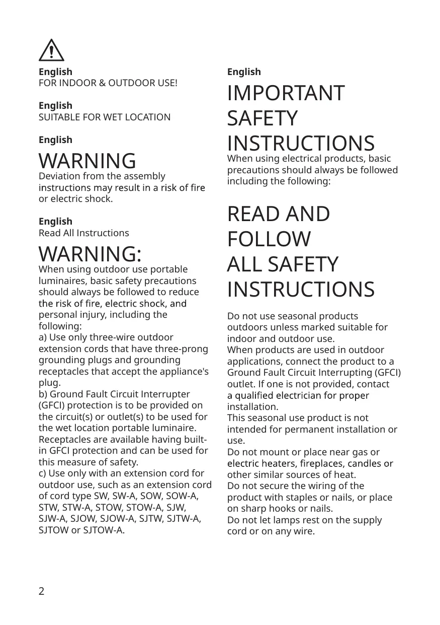 SW, SW-A, SOW, SOW-A, STW, STW-A, STOW, STOW-A, SJW, SJW-A, SJOW, LIRE ET RESPECTER TOUTES LES CONSIGNES DE SECURITE Ne pas utiliser les articles saisonniers à l'extérieur s'il n'est pas précisé qu'ils peuvent être utilisés à l'intérieur et