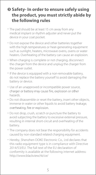 + Hereby, Shenzhen DOKE Electronic Co, Ltd declares that this radio equipment type is in compliance with Directive 2014/53/EU. The ful text ofthe EU declaration of conformity is available at the following internet address. http//mwwblackviewhk/ce/