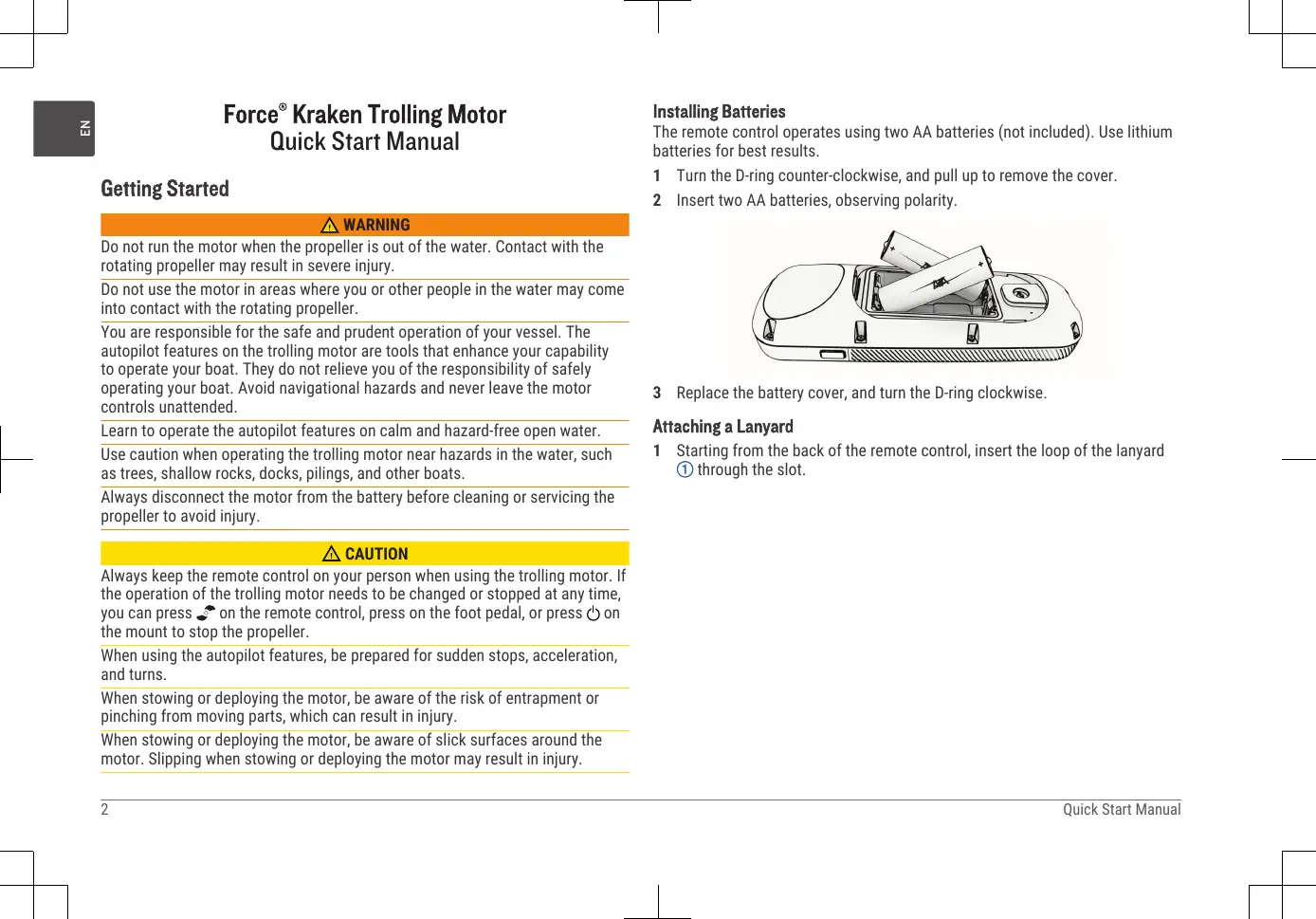 Force° Kraken Trolling Motor glissantes autour du moteur. Si vous glissez en stockant ou en déployant le Manuel de démarrage rapide moteur, vous risquez de vous blesser. Installation des piles Getting Started La télécommande nécessite deux piles AA (non fournies). Pour des résultats