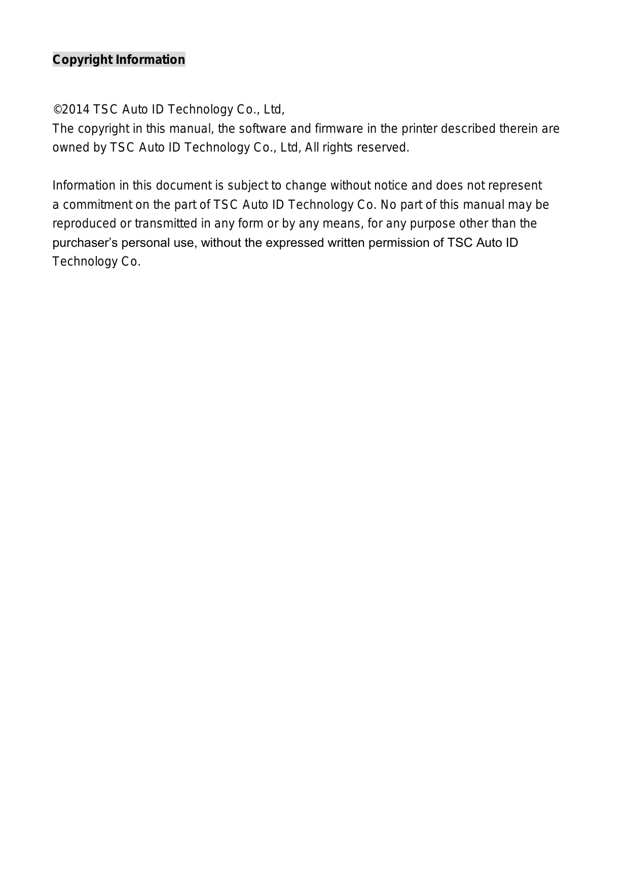 Copyright Information ©2014 TSC Auto ID Technology Co., Ltd, The copyright in this manual, the software and firmware in the printer described therein are owned by TSC Auto ID Technology Co., Ltd, All rights reserved. Information in this document is subject to change without notice and does not represent a commitment on the part of TSC Auto ID Technology Co. No part of this manual may be reproduced or transmitted in any form or by any means, for any purpose other than the purchaser’s personal use, without the expressed written permission of TSC Auto ID Technology Co.