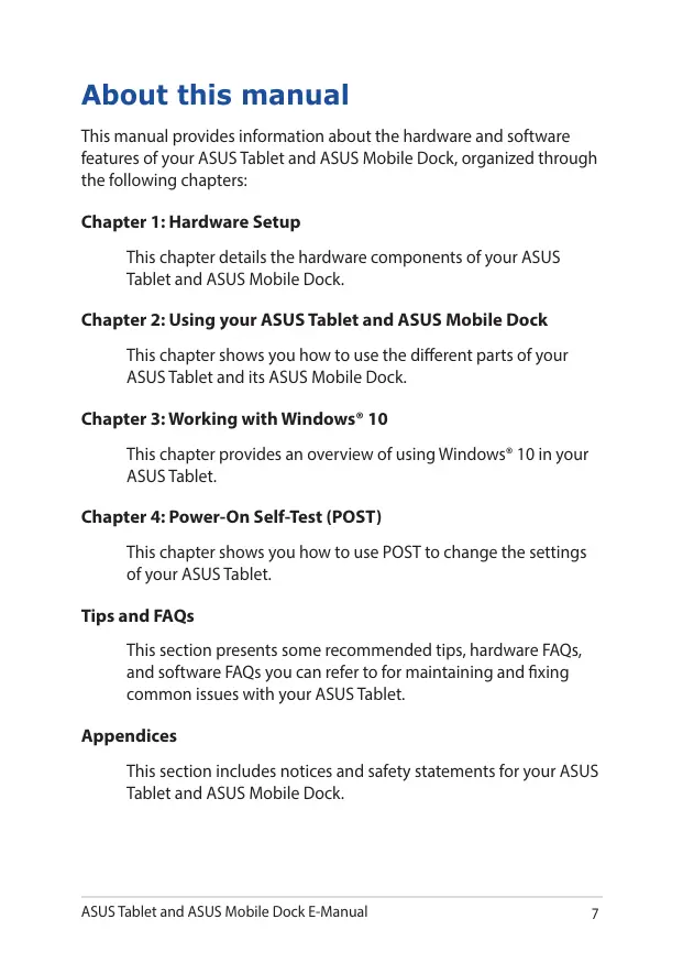 This chapter shows you how to use POST to change the settings of your ASUS Tablet. Tips and FAQs This section presents some recommended tips, hardware FAQs, and software FAQs you can refer to for maintaining and fixing common issues with your ASUS Tablet. Appendices This section includes notices and safety statements for your ASUS Tablet and ASUS Mobile Dock. ASUS Tablet and ASUS Mobile Dock E-Manual