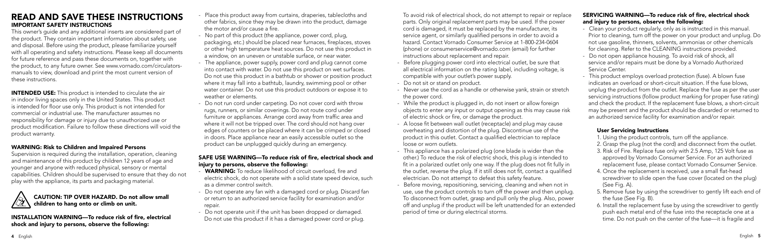 3. Risk of Fire. Replace fuse only with 2.5 Amp, 125 Volt fuse as approved by Vornado Consumer Service. For an authorized replacement fuse, please contact Vornado Consumer Service.