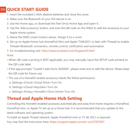 5 Nommez le capteur de mouvement intligent SMS2 Attibuez le à une pièce. 6 Configurez un hub Apple Home (HomsPod Mini et Apple TVAK2021 ou pus récent avec Thread) pour active La conneon Threac Bluetooth a télécommande a notation et 'automatiaton 7. Pour le dépannage visitez: vu onvistech com/Suppor/9 ni Remarque. Larsque lecture du caie R rest PAS applicable, vous pouvez saisi manuellement le code SETUP imprimé aura page de couverure. Silapplicaion vous indique "Couldnt add On 200000, veilez réinitialiser triste l'appareiL Veuillez conserver code QR pour une utilisation utérieure. Lutiation d'un accessoire compatible Hamek nécessite les autorisations suivantes à Paramétresilout Cloud Drive Mettre en marche Paramètres Cloud Kaychain> Activer € Paramètres» Prvsey>Hemekit> Onis Homes Tu On