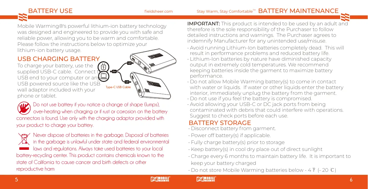 BATTERY USE fieldsheer.com Stay Warm, Stay Comfortable” BATTERY MAINTENANCE , IMPORTANT: This product is intended to be used by an adult and Mobile Warming®s powerful lithium-ion battery technology Was designed and enginegred 19 provide you with safe and therefore is the sole responsibility of the Purchaser to follow relable poner alloirg you to be warm and comortable. detailed instructions and warnings. The Purchaser agrees to : < indemnify Manufacturer for any unintended use/misuse Please follow the instructions below to D your Avoid running Lithium-lon batteries completely dead. This wil lithium-ion battery usage result in performance problems and reduced battery life. USB CHARGING BATTERY Lithium-lon batteries by nature have diminished capacity To charge your battery, use the output in extremely cold temperatures. We recommend supplied USB-C cable. Connect keeping batteries inside the garment to maximize battery