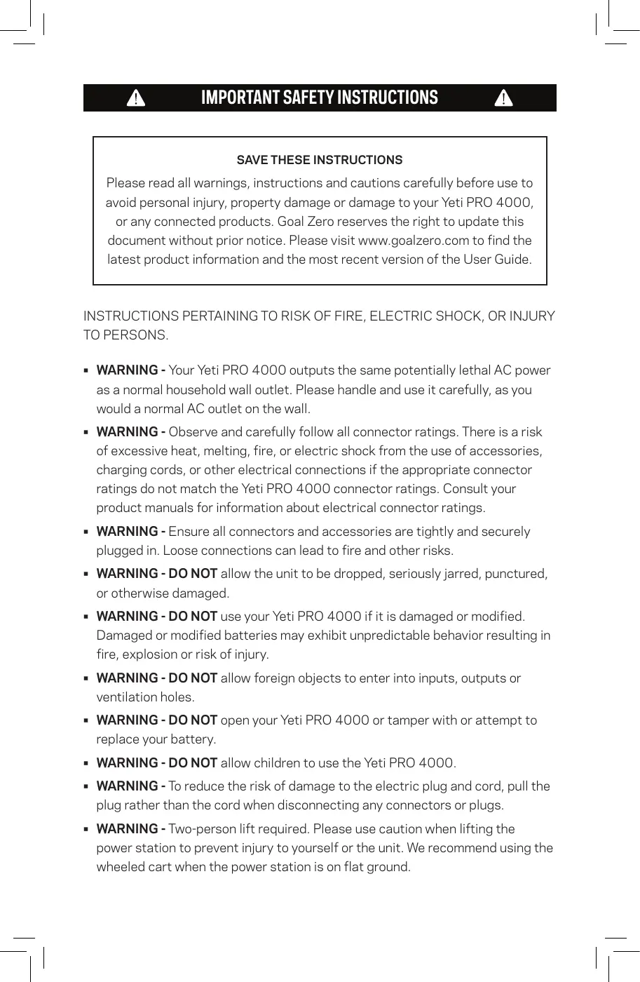 USER MANUAL YETI PRO 4000 GOAL ZERO
