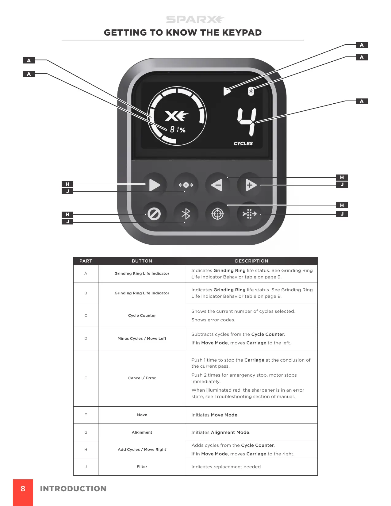 à Grinding Ring Life Indicator Indicates Grinding Ring life status. See Grinding Ring Life Indicator Behavior table on page 9 Indicates Grinding Ring life status. See Grinding Ring 8 Grinding Ring Life Indicator Life Indicator Behavior table on page 9 Shows the current number of cycles selected c Cycle Counter Shows error codes Subtracts cycles from the Cycle Counter. D Minus Cycles / Move Left If in Move Mode, moves Carriage to the left. Push 1 time to stop the Carriage at the conclusion of the current pass. : Cancel / Error Push 2 times for emergency stop, motor stops immediately. When illuminated red, the sharpener is in an error state, see Troubleshooting section of manual F Move Initiates Move Mode. & Alignment Initiates Alignment Mode. Adds cycles from the Cycle Counter. H Add Cycles / Move Right If in Move Mode, moves Carriage to the right. J Filter Indicates replacement needed INTRODUCTION