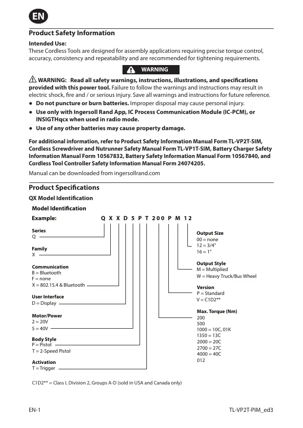 For additional information, refer to Product Safety Information Manual Form TL-VP2T-SIM, Cordless Serewdriver and Nutrunner Safety Manual Form TL-VP1T-SIM, Battery Charger Safety Information Manual Form 10567832, Battery Safety Information Manual Form 10567840, and Cordless Tool Controller Safety Information Manual Form 24074205.
