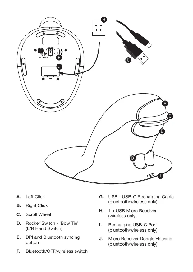 Le micro-récepteur USB 2,4 Ghz se trouve à l'intérieur du logement situé en dessous de la souris Penguin (J).