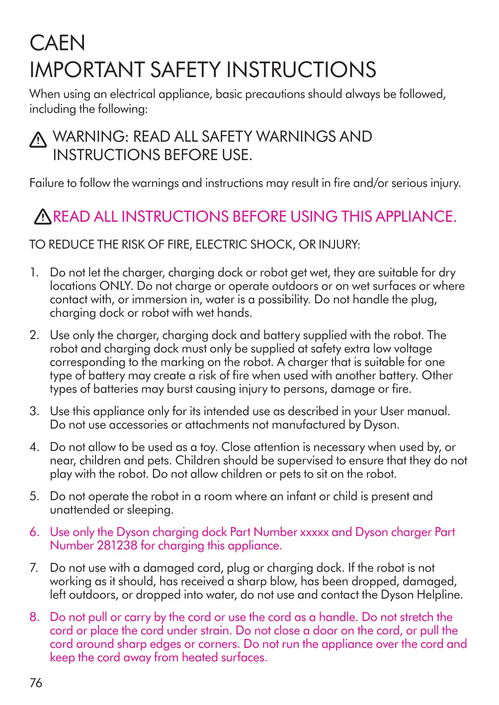 19. Tout entretien doit être effectué par Dyson ou par un représentant autorisé au moyen de pièces de rechange Dyson authentiques seulement. Ces mesures de précaution assurent la sécurité du robot. Ne pas modifier ou tenter de réparer l'appareil.