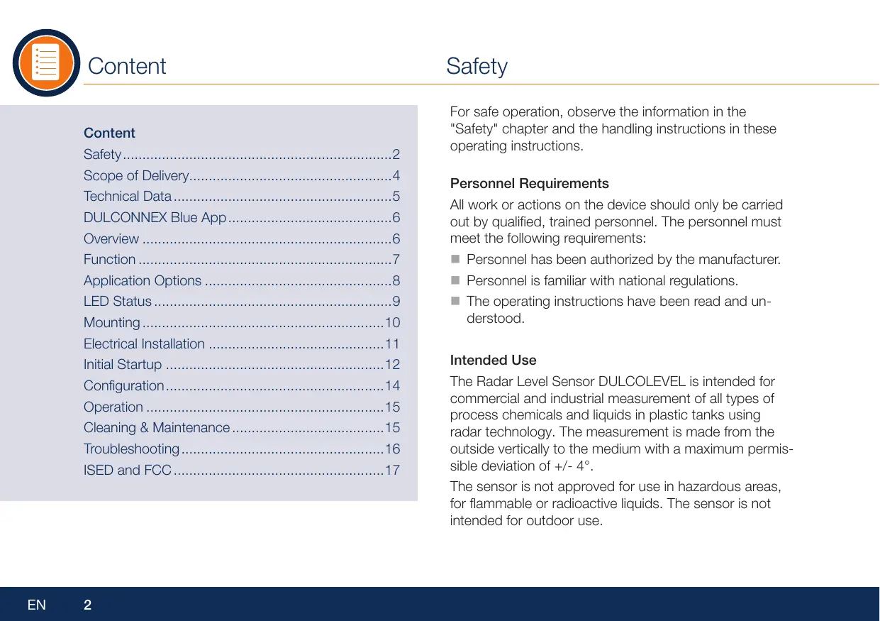 La sonde de contrôle de niveau radar DULCOLEVEL est conçue pour la mesure commerciale ou industrielle de tous les types de produits chimiques de process et de liquides dans des réservoirs en plastique au moyen de la technologie radar. La mesure s'effectue de l'extérieur perpendiculairement au fluide avec un écart maximal admissible de +/- 4°.
