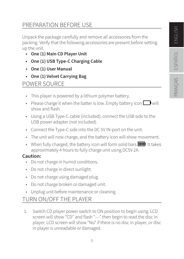 PRÉPARATION AVANT UTILISATION SOURCE D'ÉNERGIE ALLUMER/ÉTEINDRE LE LECTEUR CONNEXION DES ÉCOUTEURS LECTURE À PARTIR D'UNE CLÉ USB APPAIRAGE ET LECTURE BLUETOOTH...