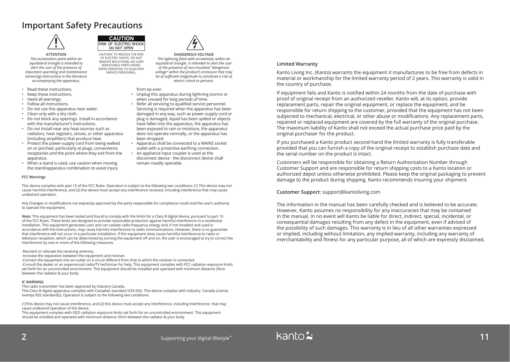 Ce système d'enceintes amplifiées a été soigneusement testé et inspecté en cours de production, et avant l'emballage et l'expédition, Après le déballage, s'il vous plaît vérifier les dommages. Il est rare qu'un appareil est endommagé pendant le transport, mais si cela se produit, contactez votre revendeur immédiatement. Vous pouvez également appeler directement à Kanto 1-888-848-2643 ou par e-mail à support@kantoliving.com.