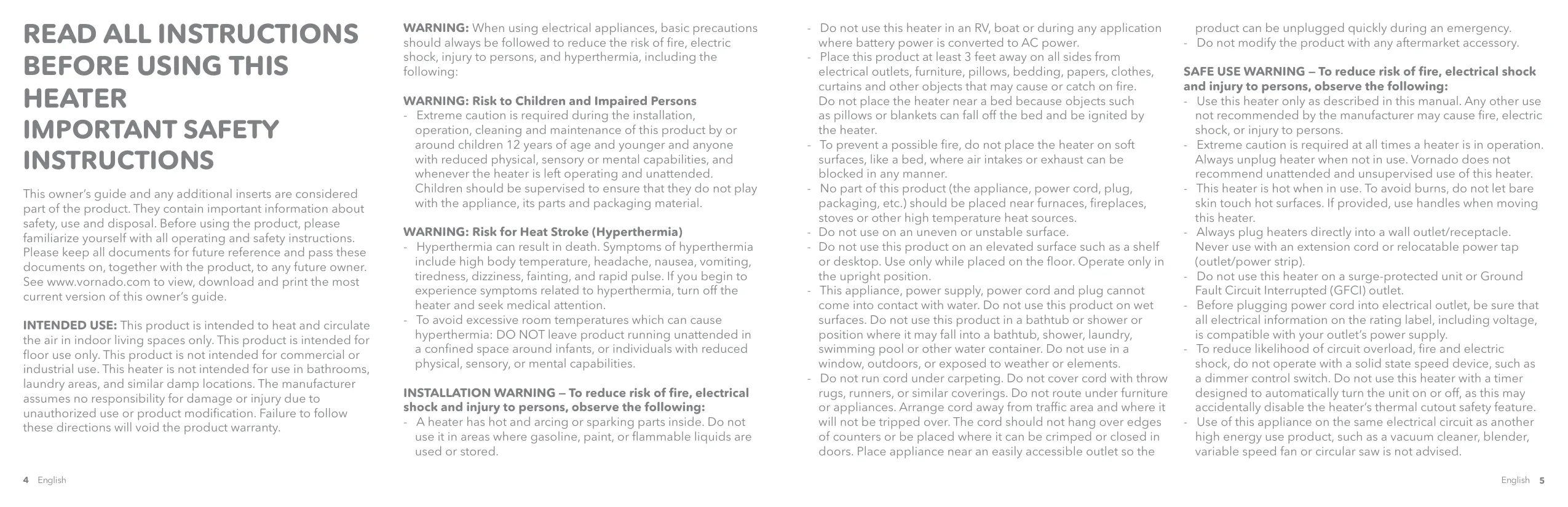 UTILISATION PRÉVUE : Ce produit est conçu pour réchauffer et faire circuler l'air dans les pièces intérieures seulement. Ce produit est destiné à une utilisation au sol uniquement. Ce produit n'est pas conçu pour une utilisation commerciale où industrielle. Cet appareil de chauffage n'est pas destiné à être