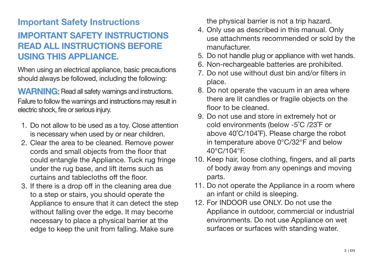 (température inférieure à -5 °C/23 °F ou supérieure à 40 °C/104 °F). Veuillez charger le robot à une température supérieure à 0 °C/32 °F et inférieure à 40 °C/104 °F.