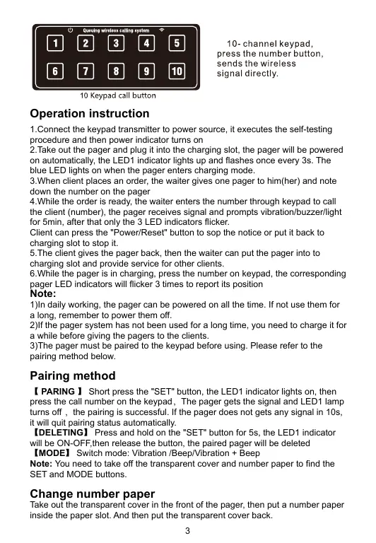 4-Lorsque la commande est prête, le personnel de service appuie sur le clavier pour appeler le client (numéro), le récepteur correspondant obtient les. informations et demande des vibrations / buzzer / lumière pendant 5min Après cela, seuls les 3 indicateurs LED clignotent