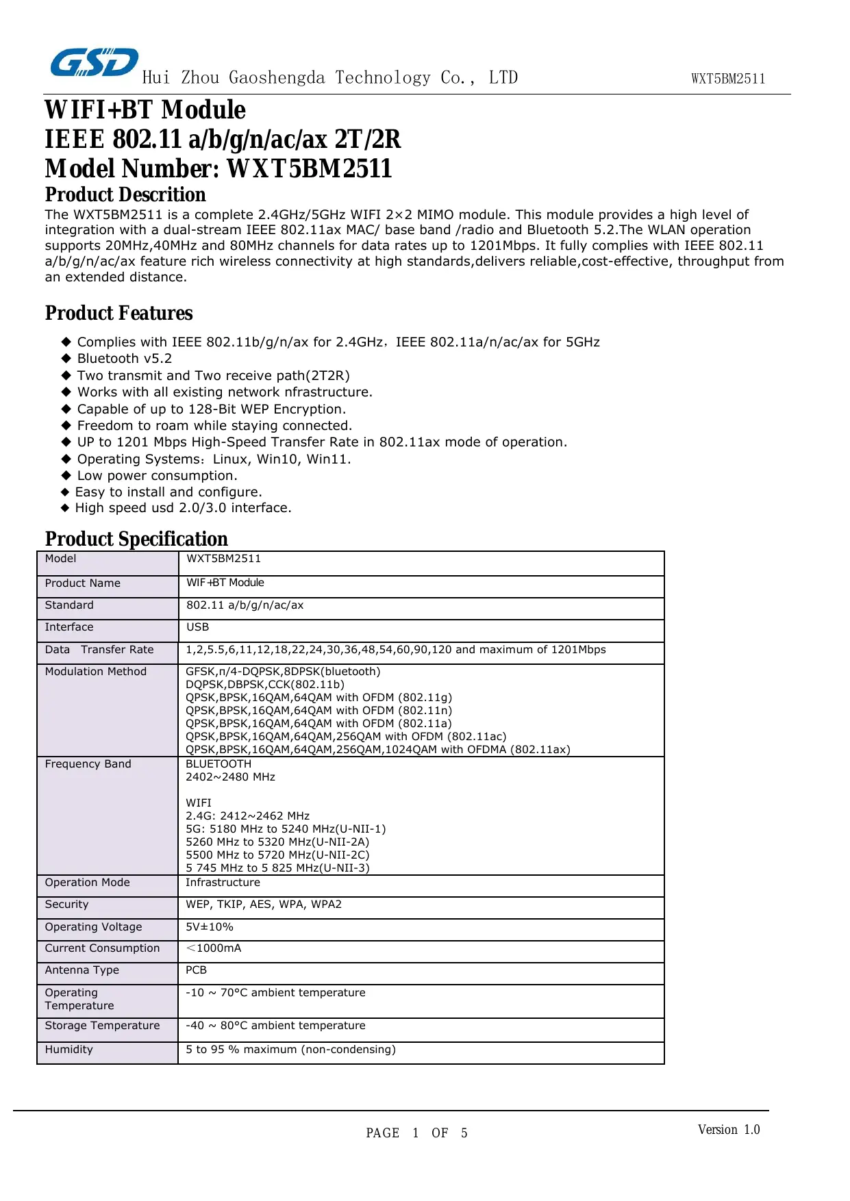 Download the instructions for your Module WIFI+BT in PDF format for free! Find your manual WXT5BM2511 - Hui Zhou Gaoshengda Technology and take your electronic device back in hand. On this page are published all the documents necessary for the use of your device. WXT5BM2511 by Hui Zhou Gaoshengda Technology.
