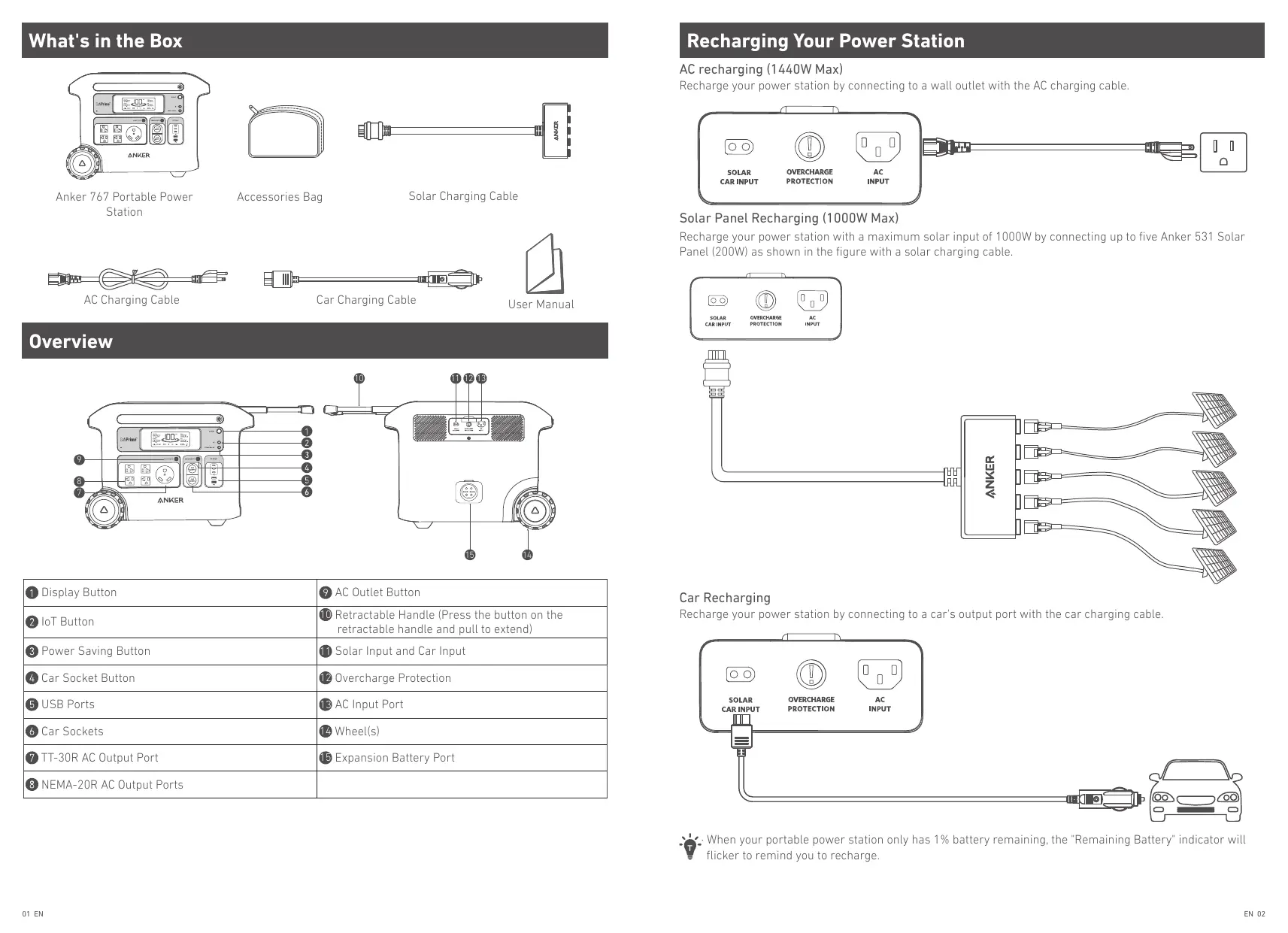 OVERCHARGE PROTECTION INPUT Lorsque votre centrale électrique portable n'a plus que 1 % de batterie, le voyant de batterie restante clignote pour vous rappeler de recharger le produit.