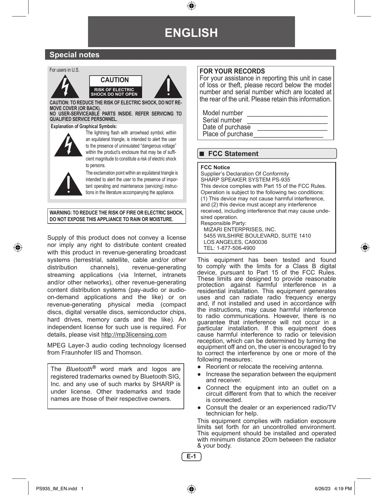 USER MANUAL PS-935 SHARP