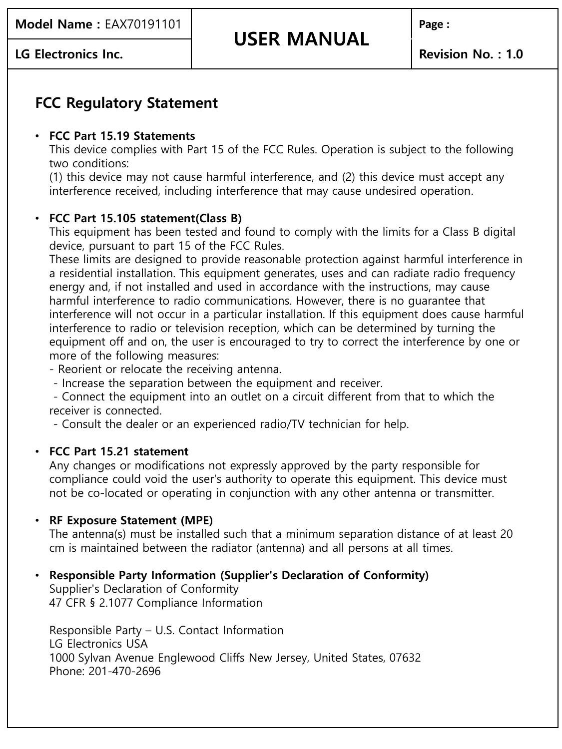 USER MANUAL EAX70191101 LG