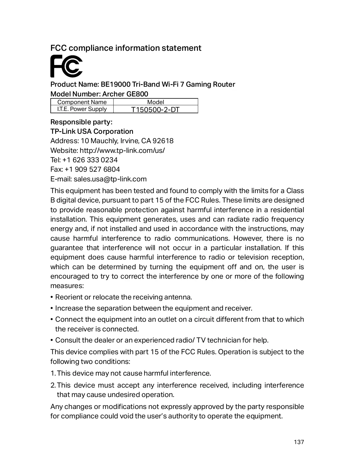 We, TP-Link USA Corporation, has determined that the equipment shown as above has been shown to comply with the applicable technical standards, FCC part 15. There is no unauthorized change is made in the equipment and the equipment is properly maintained and operated.