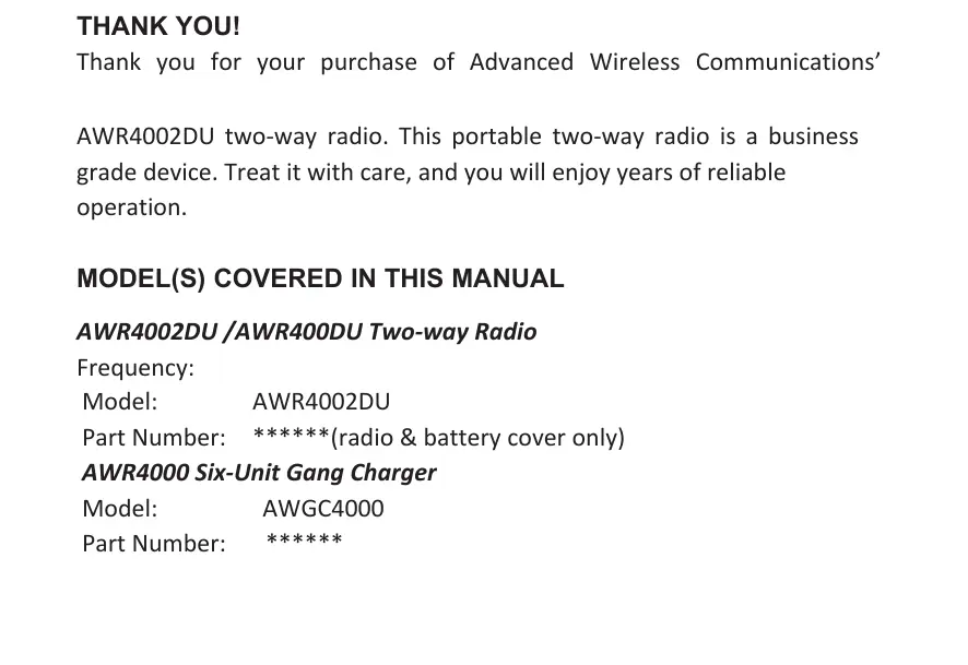 Download the instructions for your Radio bidirectionnelle in PDF format for free! Find your manual AWR400DU - Advanced Wireless Communications and take your electronic device back in hand. On this page are published all the documents necessary for the use of your device. AWR400DU by Advanced Wireless Communications.