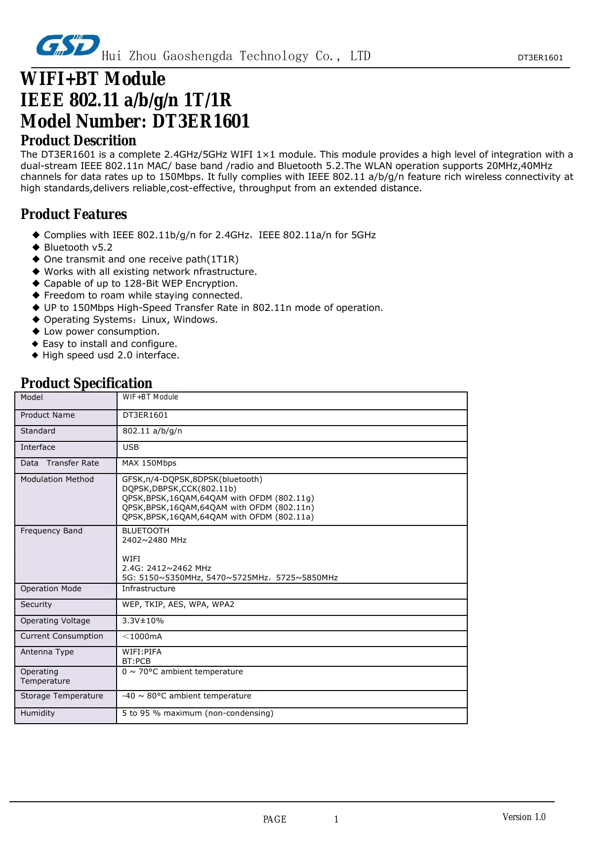 DT3ER1601 - Module WIFI+BT Hui Zhou Gaoshengda Technology Co., LTD - Free user manual and instructions