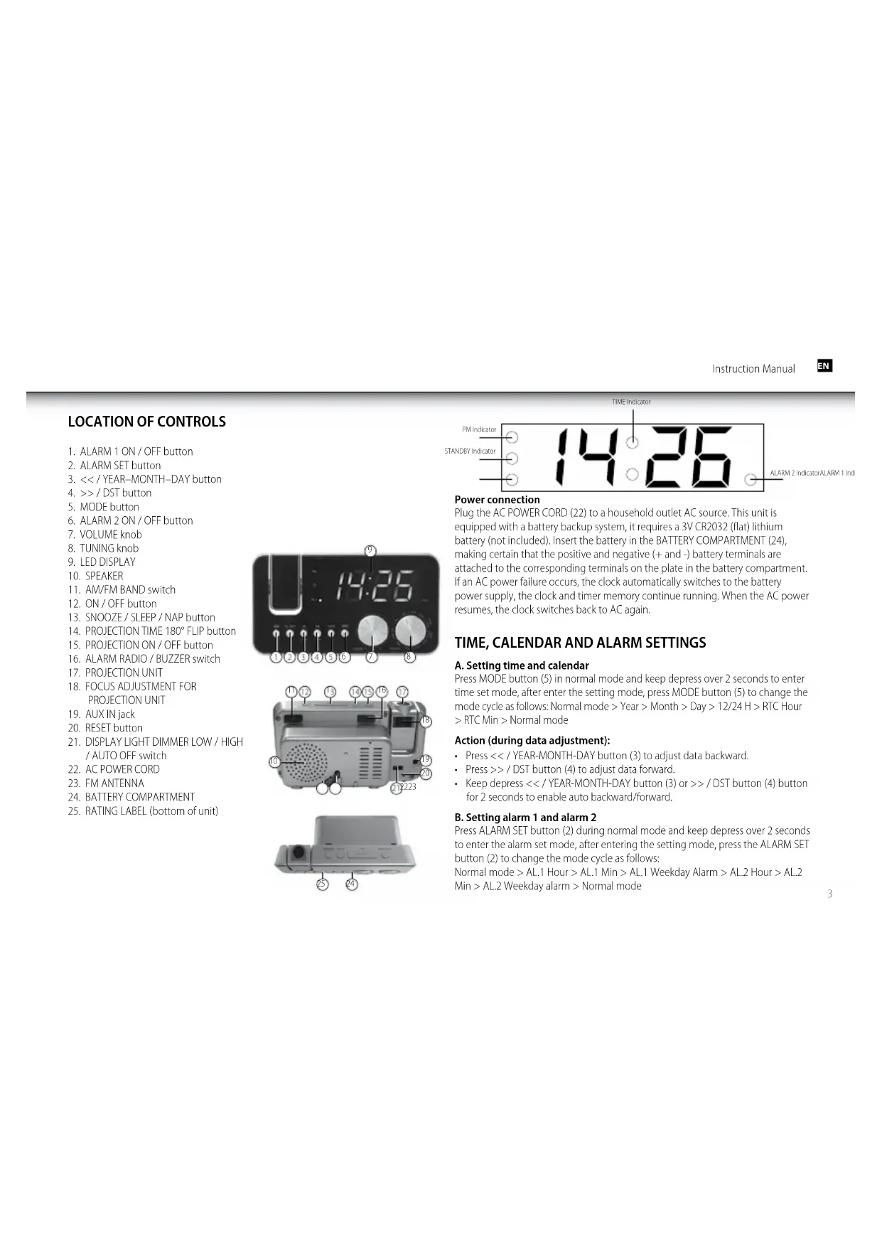 - Ensure that the FM antenna (23) is completely unrolled and extended for best FM reception. Aux in jack The AUX IN jack (19) can be used to playback alternate audio signal sources on the unit speakers. This AUX IN jack (19) requires a 3.5mm audio cable for an input signal (3.5mm audio cable is not included). SPECIFICATIONS Frequency : AM 530 – 1600 kHz / FM 88 – 108 MHz Battery backup : 1 x 3V CR2032 (flat) lithium battery (not included) Power source : AC230V - 50Hz, 5W Reset The RESET button (20) is located on the back of the unit. Use a ballpoint pen to press the RESET button (20) whenever you change the batteries, or when the unit is not performing as expected. This will return all settings to the default value, you will lose any stored data (alarm and clock settings). Projection unit