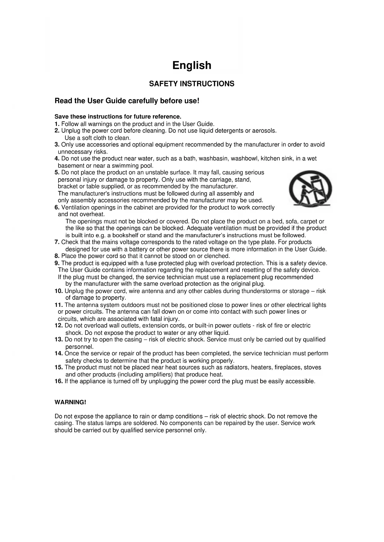 - Do not place the product on an unstable surface. It may fall, causing serious personal injury or damage to property. Only use with the carriage, stand, bracket or table supplied, or as recommended by the manufacturer.