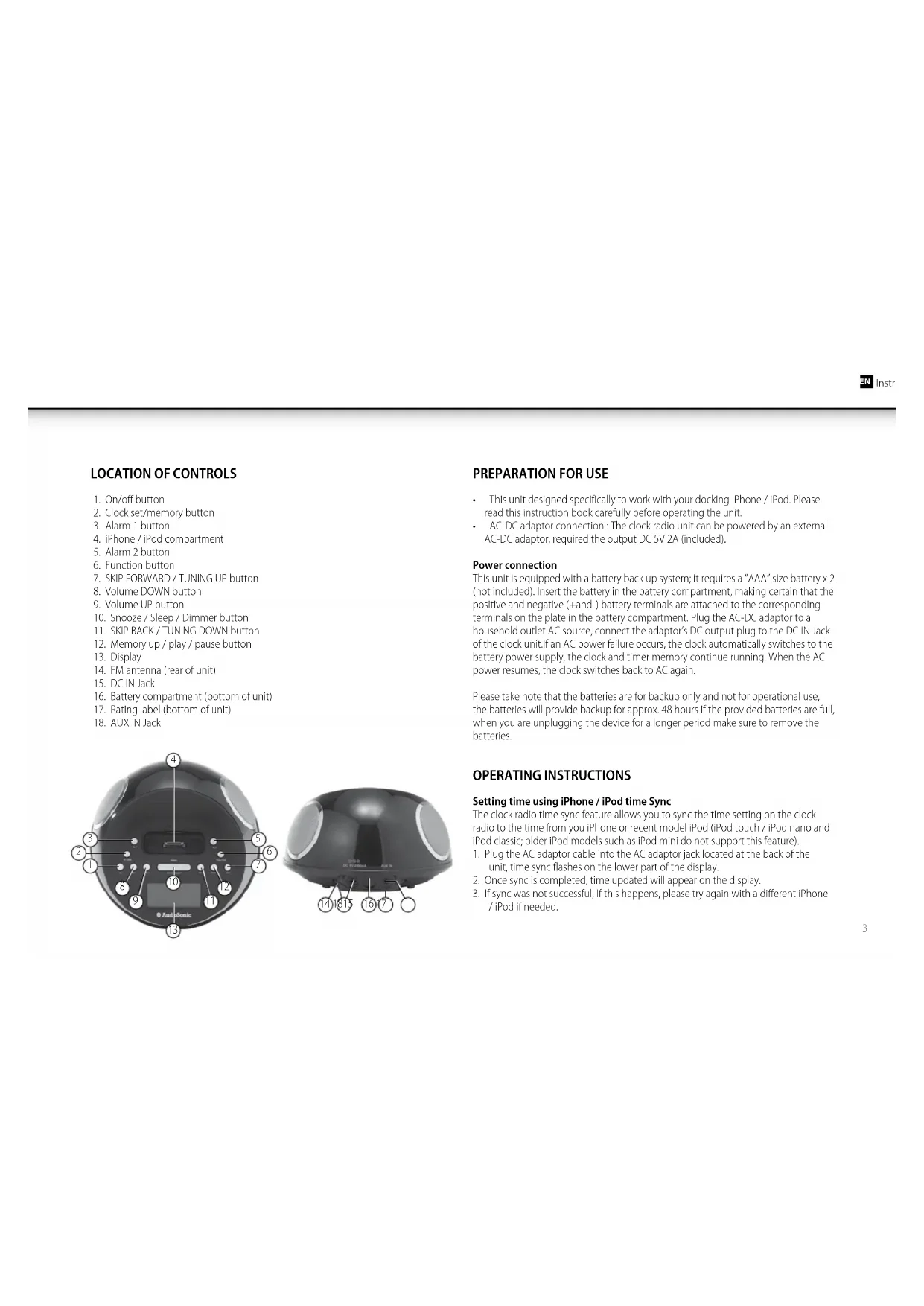 - AC-DC adaptor connection : The clock radio unit can be powered by an external AC-DC adaptor, required the output DC 5V 2A (included). Power connection This unit is equipped with a battery back up system; it requires a “AAA” size battery x 2 (not included). Insert the battery in the battery compartment, making certain that the positive and negative (+and-) battery terminals are attached to the corresponding terminals on the plate in the battery compartment. Plug the AC-DC adaptor to a household outlet AC source, connect the adaptor’s DC output plug to the DC IN Jack of the clock unit.If an AC power failure occurs, the clock automatically switches to the battery power supply, the clock and timer memory continue running. When the AC power resumes, the clock switches back to AC again. Please take note that the batteries are for backup only and not for operational use, the batteries will provide backup for approx. 48 hours if the provided batteries are full, when you are unplugging the device for a longer period make sure to remove the batteries. OPERATING INSTRUCTIONS Setting time using iPhone / iPod time Sync The clock radio time sync feature allows you to sync the time setting on the clock radio to the time from you iPhone or recent model iPod (iPod touch / iPod nano and iPod classic; older iPod models such as iPod mini do not support this feature).