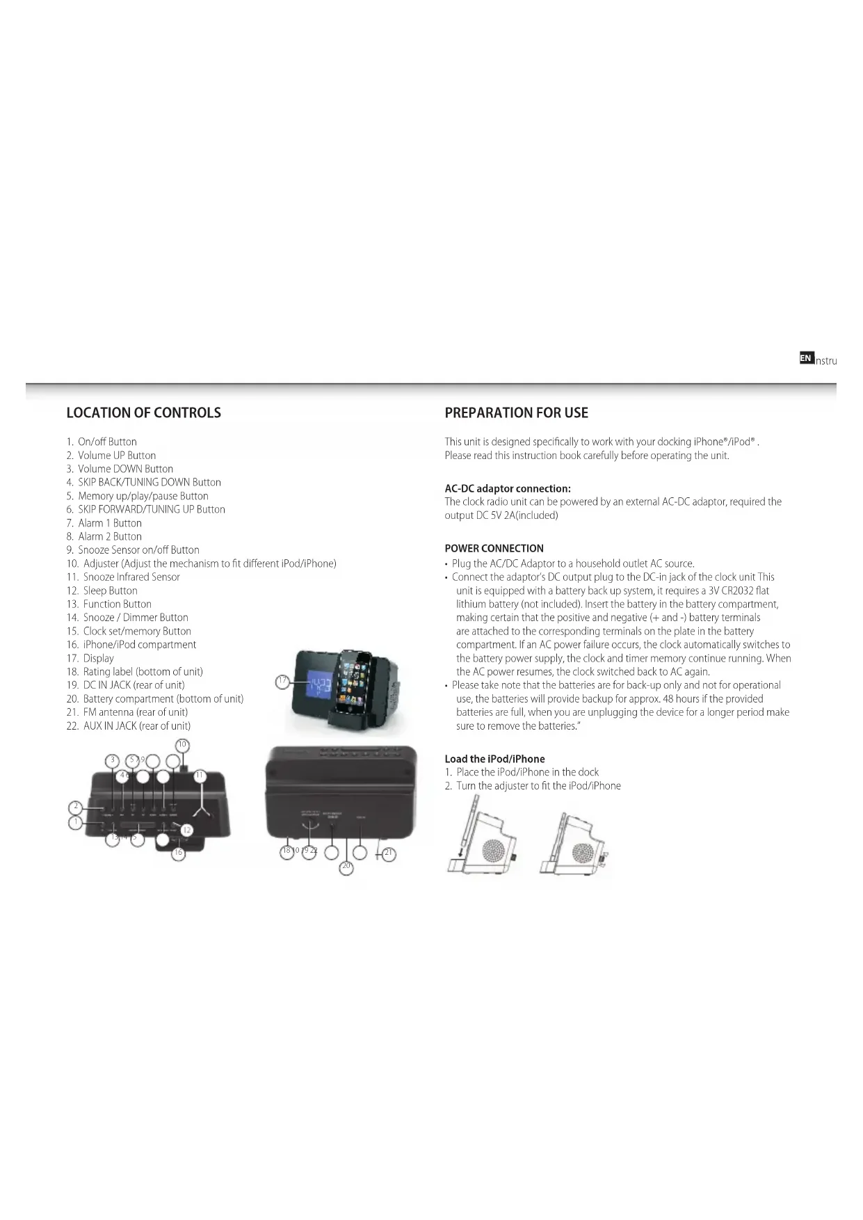 This unit is designed specifically to work with your docking iPhone®/iPod® . Please read this instruction book carefully before operating the unit. AC-DC adaptor connection: The clock radio unit can be powered by an external AC-DC adaptor, required the output DC 5V 2A(included) POWER CONNECTION