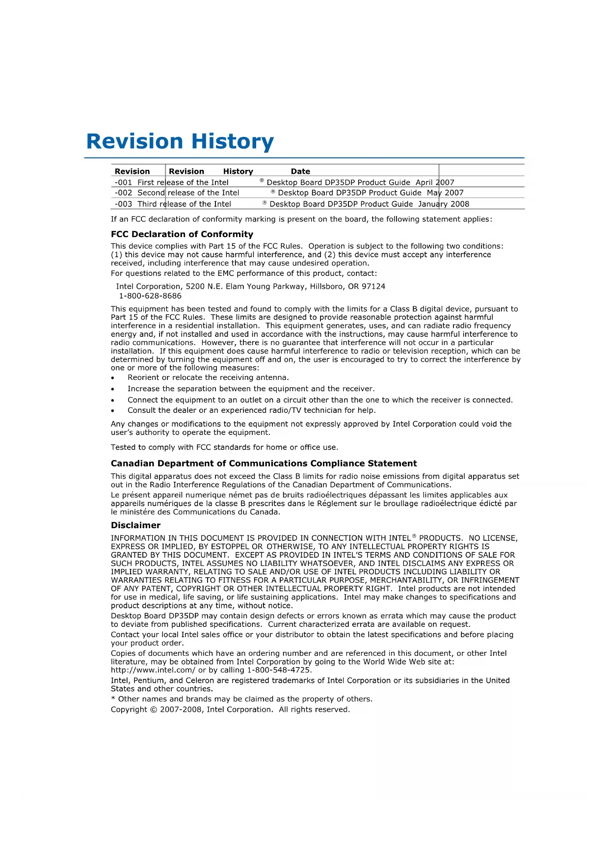 - Other names and brands may be claimed as the property of others. Copyright © 2007-2008, Intel Corporation. All rights reserved.iii Preface This Product Guide gives information about board layout, component installation, BIOS update, and regulatory requirements for Intel