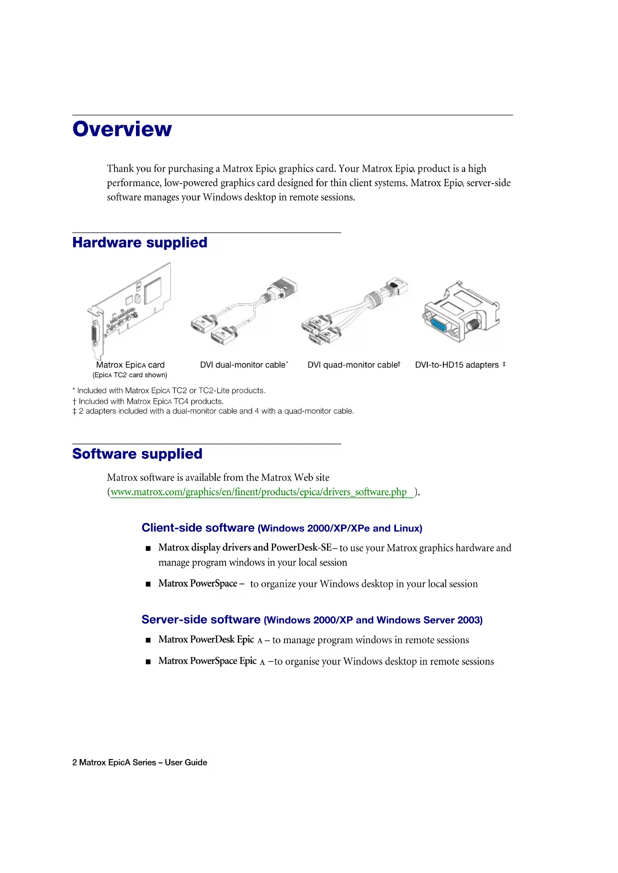 - Included with Matrox EpicA TC2 or TC2-Lite products.DVI quad-monitor cable † Included with Matrox EpicA TC4 products.DVI-to-HD15 adapters ‡ 2 adapters included with a dual-monitor cable and 4 with a quad-monitor cable.Matrox EpicA Series – User Guide 3 Installation overview To install your Matrox product: