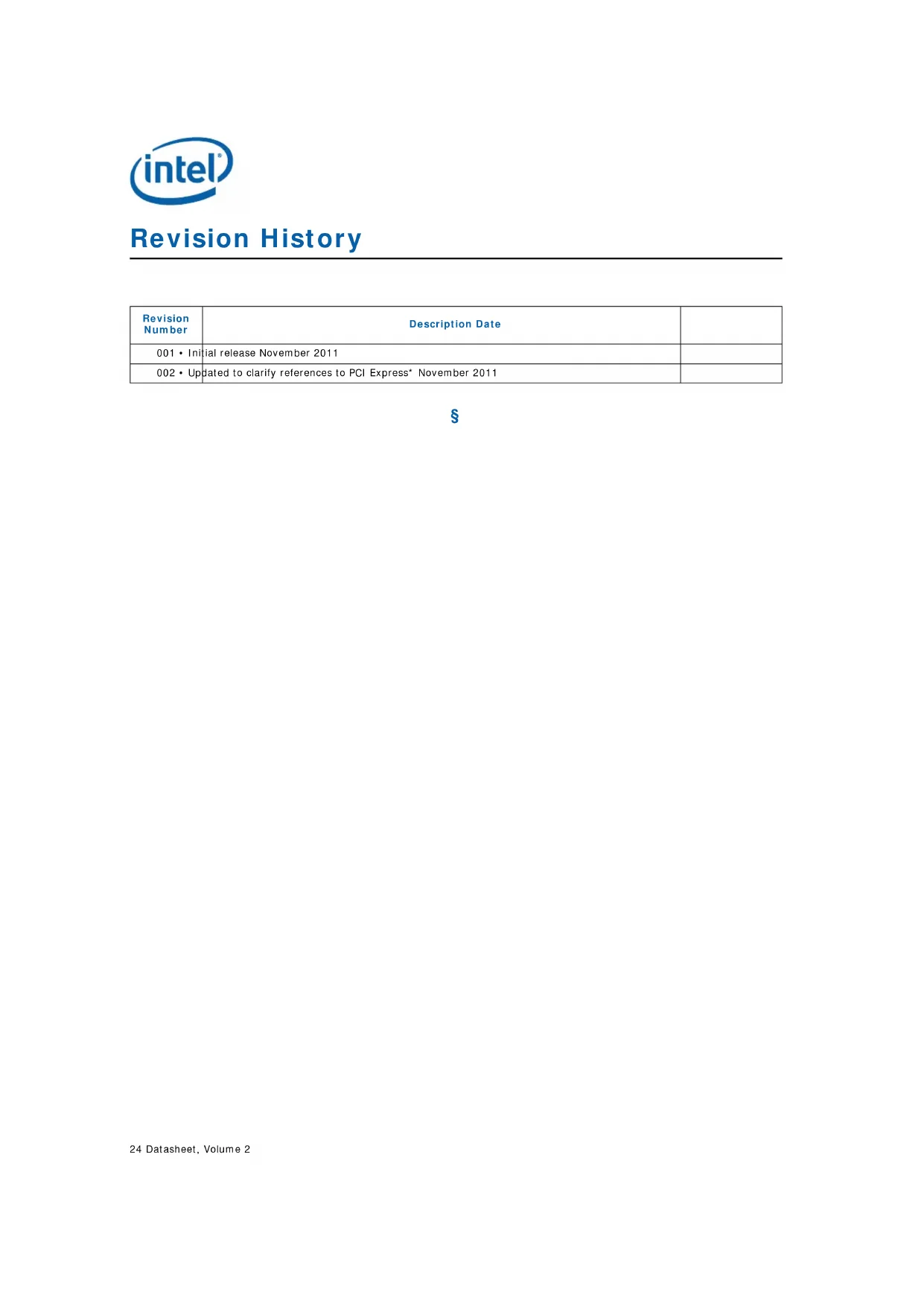 Revision Number Description Date 001 • Initial release November 2011 002 • Updated to clarify references to PCI Express* November 2011Datasheet, Volume 2 25 Introduction 1 Introduction This document is Volume 2 of the datasheet for the Intel