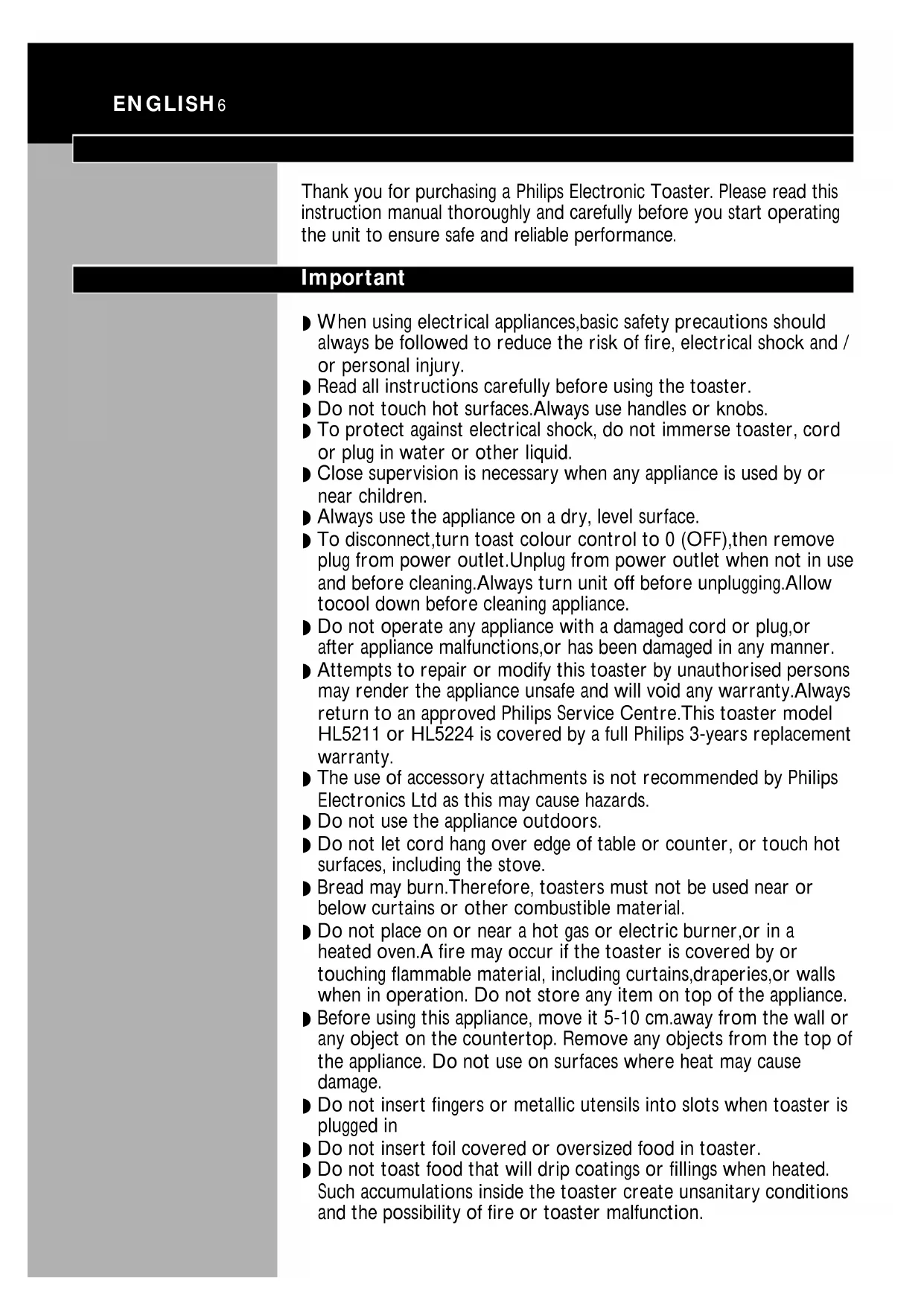 Thank you for purchasing a Philips Electronic Toaster. Please read this instruction manual thoroughly and carefully before you start operating the unit to ensure safe and reliable performance.