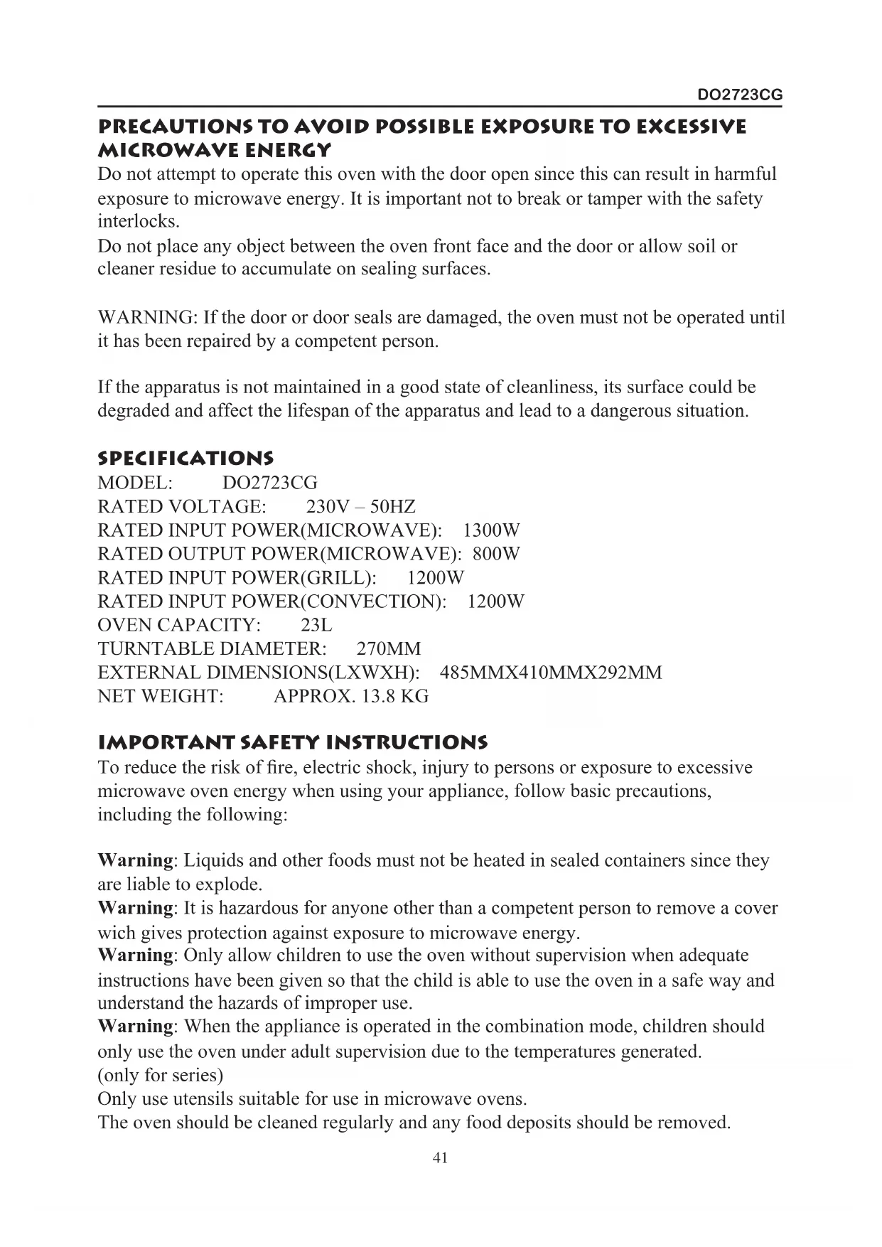 SPECIFICATIONS MODEL: DO2723CG RATED VOLTAGE: 230V – 50HZ RATED INPUT POWER(MICROWAVE): 1300W RATED OUTPUT POWER(MICROWAVE): 800W RATED INPUT POWER(GRILL): 1200W RATED INPUT POWER(CONVECTION): 1200W OVEN CAPACITY: 23L TURNTABLE DIAMETER: 270MM EXTERNAL DIMENSIONS(LXWXH): 485MMX410MMX292MM NET WEIGHT: APPROX. 13.8 KG IMPORTANT SAFETY INSTRUCTIONS To reduce the risk of re, electric shock, injury to persons or exposure to excessive