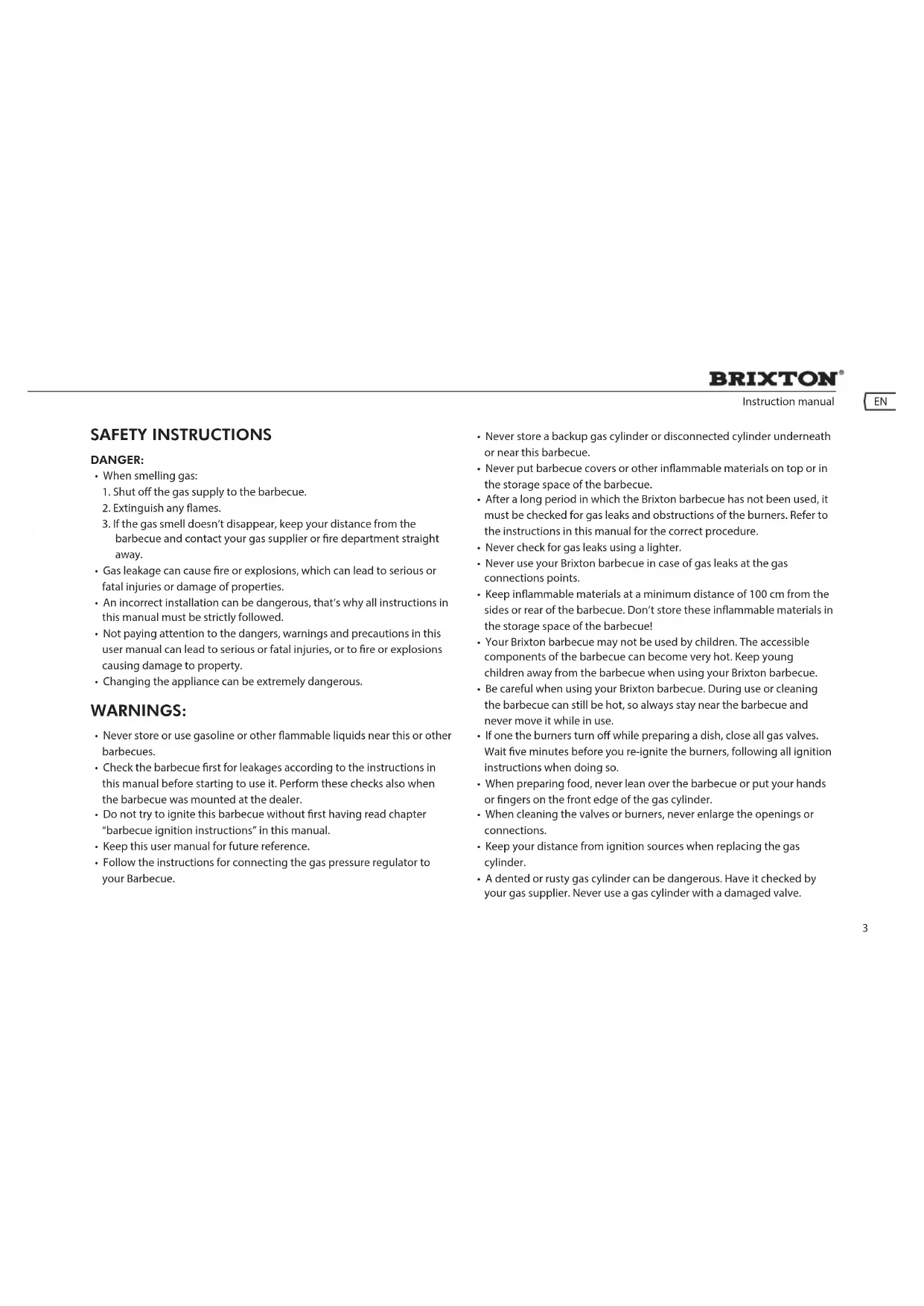 • Never use your Brixton barbecue in case of gas leaks at the gas