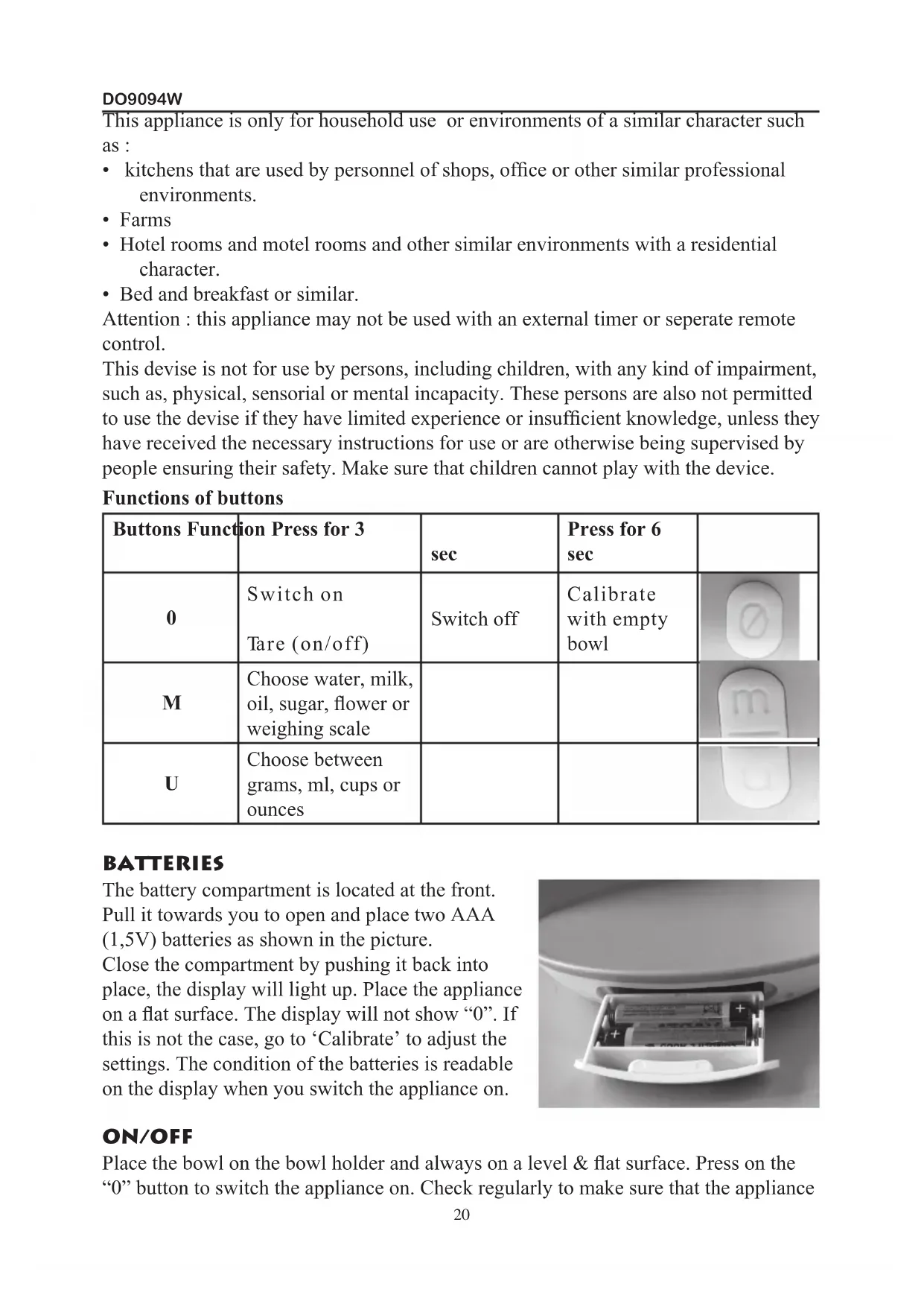 19DO9094W This appliance is only for household use or environments of a similar character such