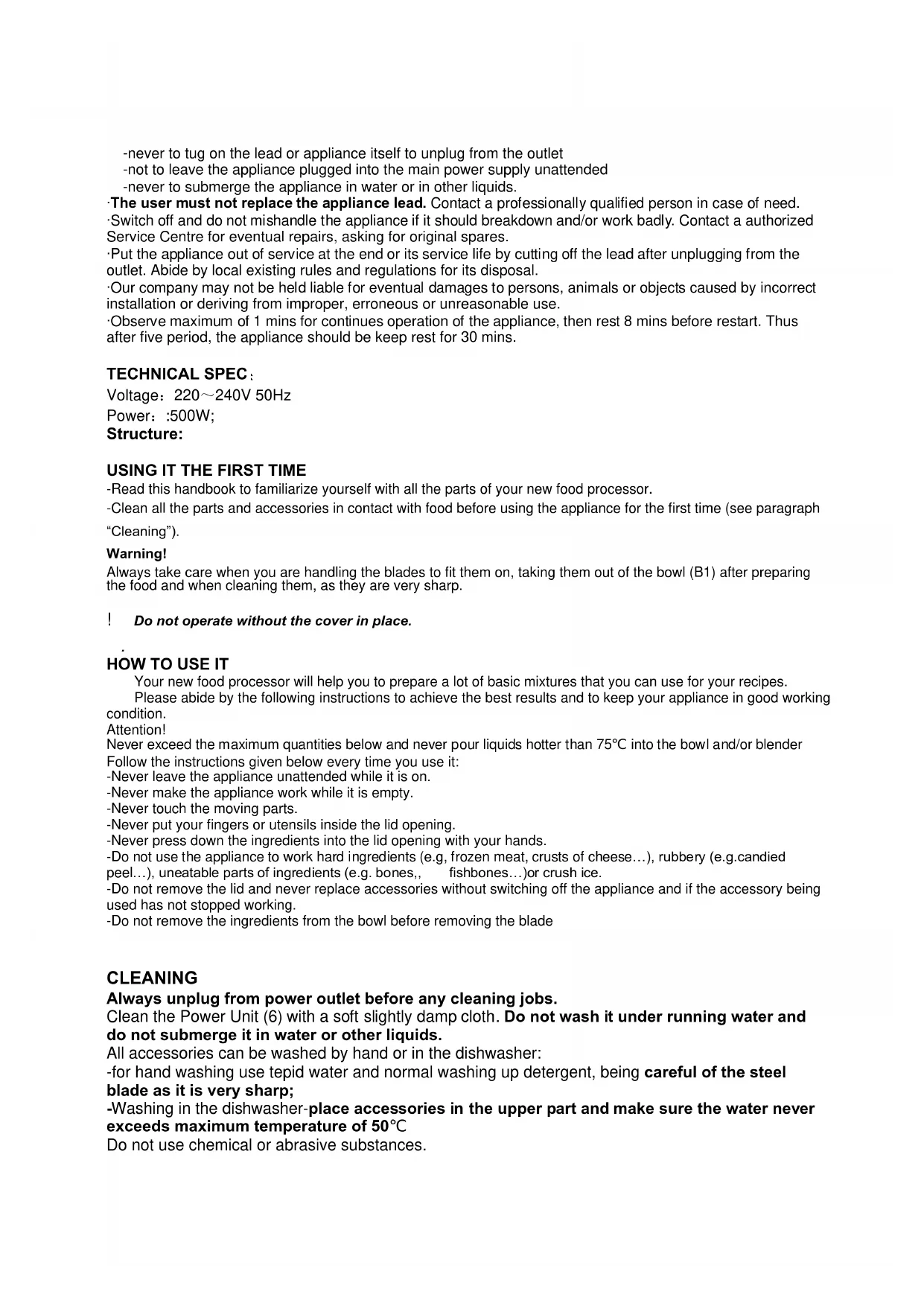 -Read this handbook to familiarize yourself with all the parts of your new food processor. -Clean all the parts and accessories in contact with food before using the appliance for the first time (see paragraph “Cleaning”). Warning! Always take care when you are handling the blades to fit them on, taking them out of the bowl (B1) after preparing the food and when cleaning them, as they are very sharp. ! Do not operate without the cover in place.