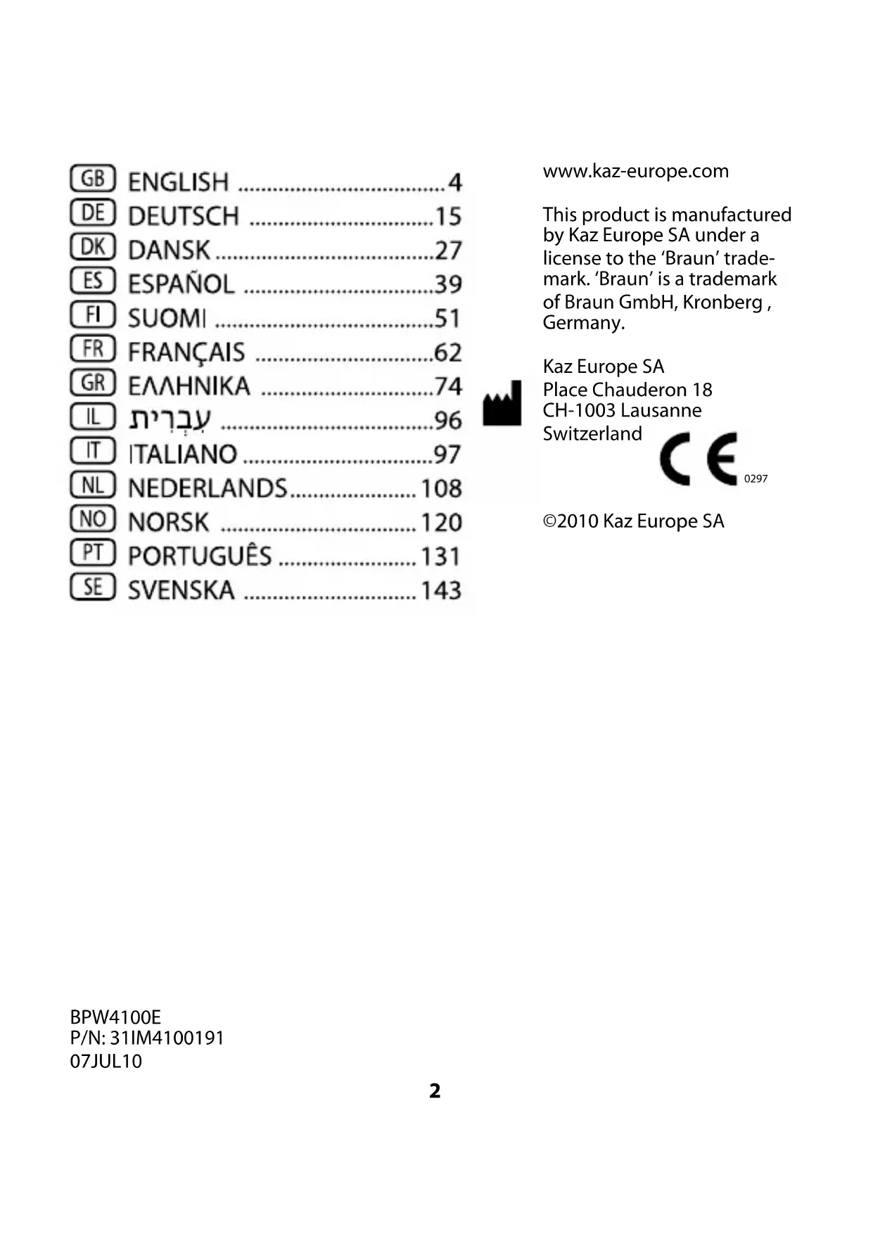 www.kaz-europe.com This product is manufactured by Kaz Europe SA under a license to the ‘Braun’ trade- mark. ‘Braun’ is a trademark of Braun GmbH, Kronberg , Germany. Kaz Europe SA Place Chauderon 18 CH-1003 Lausanne Switzerland ©2010 Kaz Europe SA3