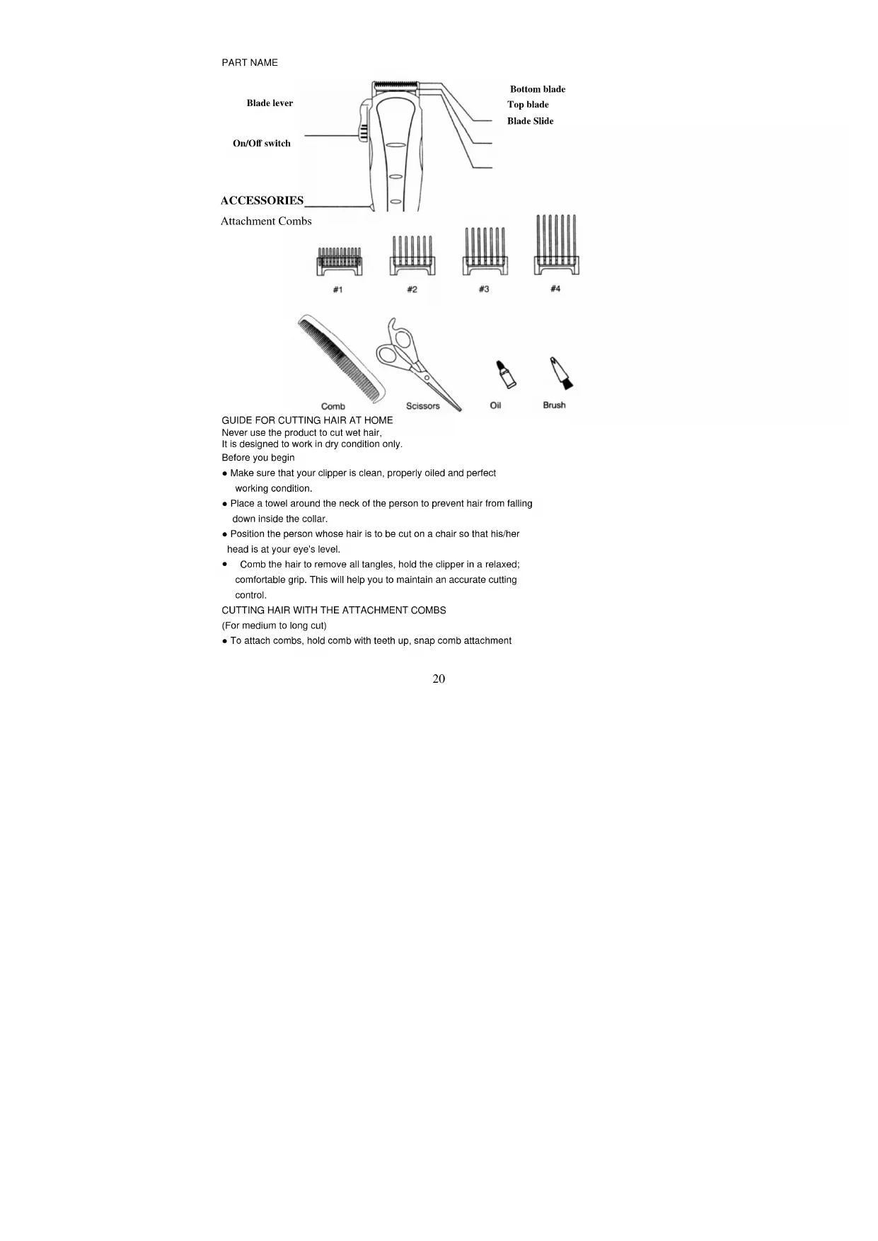 The four basic areas illustrated on the hair cutting guide are your "road map" to easy do-it- yourself hair cutting. MAINTENANCE ● Your clippers were carefully examined to ensure that the blades were oiled and aligned before leaving our factory. ● Blades must be realigned if they have been removed for cleaning or replacement. To realign the blades, simply match the upper and bottom blades teeth up, point for point. (End of top blade teeth) should be approximately 1.2mm back from bottom blade. Compare your clipper blades with the sketch) ● If blade alignment is incorrect, add a few drops of oil to the blades, turn clipper on for a few moments, turn off and unplug. Loosen screws slightly and adjust. Tighten screws after blade is aligned. Oil ● To maintain your clipper in peak condition, the blades should be oiled every few haircuts. ● Do not use hair oil, grease, oil mixed with kerosene or any solvent. As the solvent will evaporate and leave the thick oil which may slow down the blades motion. Adjustable lever ● The lever is conveniently located near your thumb (if you're right- handed) so it can easily be adjusted while the clipper is in your hand. ● The lever adds versatility to your clipper by allowing you to gradually change the closeness of your cut without an attachment comb.24 ● When the lever is in the uppermost position, the blades will give you the closest cut and leave the hair very short. Pushing the lever downward gradually increases the cutting length. ● In its lowest position, the lever will leave the hair approximately the same length as a #1 comb. ● The lever will also extend the use of your blades since a different cutting edge is used in each setting. ● In addition, if extremely heavy hair cutting has jammed the blades, it will help you remove hair that has become wedged between the two blades without removing the blades. ● While the clipper is running, rapidly move the lever from "close cut" to "longer cut" a couple of times. Doing this each time after you have finished using your clipper will help to keep the blades clear of cut hair. If your clipper stops cutting and this does not help, your cutting blades are dulled. Replace them with new blades. Storage ● Keep the product in soft and ventilated place unreached by children. IMPORTANT SAFEGUARDS When using electrical appliances, especially when children are present, basic safety precautions should always be followed, including the following: To reduce the risk of death or injury by electric shock: ● Unplug this appliance before cleaning. ● Do not place or store appliance where it can fall or be pulled into a tub or sink. ● Do not use while bathing or in a shower, ● Do not place in, or drop into, water or other liquid. ● Do not reach for an appliance that has fallen into water. Unplug immediately. To reduce the risk of burns, electrocution, fire, or injury to persons: ● Use this appliance only for its intended use as described in this manual. ● Do not use attachments not recommended by the manufacturer. ● This appliance should never be left unattended when plugged in. ● Close supervision is necessary when this appliance is used by, on, or near children or invalids. ● Never operate this appliance if it has a damaged cord or plug, if it is not working properly. ● Keep the cord away from heated surfaces. Longer cut25 ● Do not pull, twist, or wrap line cord around appliance. ● Never drop or insert any object into any opening on this appliance. ● Before use, make certain blades are aligned properly. ● Do not place appliance on any surface while it is operating. ● Do not use this appliance with a damaged or broken comb nor with teeth missing from the blades as injury may occur. ● Do not use outdoors or operate where aerosol (spray) products are being used or where oxygen is being administered. ● Any other servicing should be performed by an authorized service representative. ● If the supply cord is damaged it must be replaced by the manufacturer or its service agent or a similarly qualified person in order to avoid a hazard.