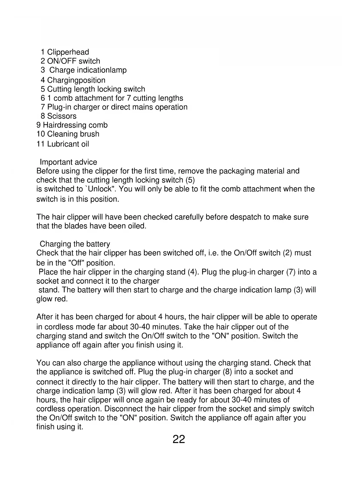 Tristar rechargeable haircutter TR-2543 Instructions for use Before use Please read these instructions attentively, They will give you important pieces of advice for the use, the security and the maintenance of the appliance Keep the instructions carefully end, should the situation arise, pass them on to further users. The appliance must only be used for the intended purpose according to these instructions. Observe the notes on safety regulations. Eliminate the packaging properly. Description22 1 Clipperhead 2 ON/OFF switch 3 Charge indicationlamp 4 Chargingposition 5 Cutting length locking switch 6 1 comb attachment for 7 cutting lengths 7 Plug-in charger or direct mains operation 8 Scissors 9 Hairdressing comb 10 Cleaning brush 11 Lubricant oil Important advice Before using the clipper for the first time, remove the packaging material and check that the cutting length locking switch (5) is switched to `Unlock". You will only be able to fit the comb attachment when the switch is in this position. The hair clipper will have been checked carefully before despatch to make sure that the blades have been oiled. Charging the battery Check that the hair clipper has been switched off, i.e. the On/Off switch (2) must be in the "Off" position. Place the hair clipper in the charging stand (4). Plug the plug-in charger (7) into a socket and connect it to the charger stand. The battery will then start to charge and the charge indication lamp (3) will glow red. After it has been charged for about 4 hours, the hair clipper will be able to operate in cordless mode far about 30-40 minutes. Take the hair clipper out of the charging stand and switch the On/Off switch to the "ON" position. Switch the appliance off again after you finish using it. You can also charge the appliance without using the charging stand. Check that the appliance is switched off. Plug the plug-in charger (8) into a socket and connect it directly to the hair clipper. The battery will then start to charge, and the charge indication lamp (3) will glow red. After it has been charged for about 4 hours, the hair clipper will once again be ready for about 30-40 minutes of cordless operation. Disconnect the hair clipper from the socket and simply switch the On/Off switch to the "ON" position. Switch the appliance off again after you finish using it.23 Mains operation Check that the appliance has been switched off, i.e. the On/Off switch must be in the "Off" position. Plug the plug-in charger (7) into a socket and connect it directly to the hair clipper. Switch the appliance on, and you can then start cutting right away. Switch the appliance off again after you finish using it. This option enables you to switch immediately to mains operation if the battery discharges unexpectedly, allowing you to finish a haircut. Using the comb attachment Hold the hair clipper back to front in your hand. Check that the cutting length locking switch (5) on the base of the hair clipper is in the "Unlock" position. Now slide the two guide rails on the comb attachment into the depressions in the casing of the clipper. The comb attachment can be set to any of 7 lengths far cutting. You can read off the set length in mm on the attachment (4 to 20mm). 1 . To set the required length, first move the cutting length locking switch to "Unlock". Place your thumbs on the ribbed surface of the comb attachment and slide it backwards or forwards until you reach the cutting length you require. Example: If the small arrow an the hair clipper paints to the arrow indicating 20mm, the set hair cutting length is 20mm, etc.