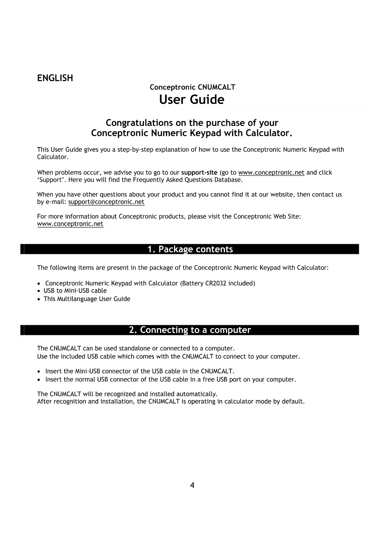 This User Guide gives you a step-by-step explanation of how to use the Conceptronic Numeric Keypad with Calculator.