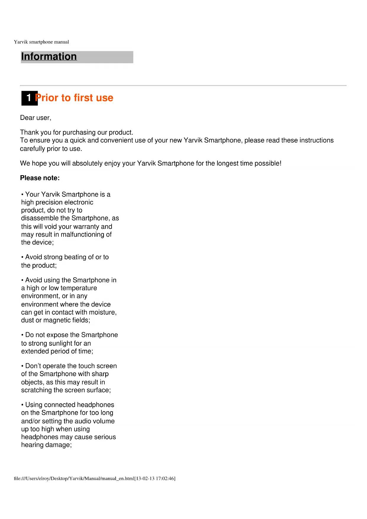 - Using connected headphones on the Smartphone for too long and/or setting the audio volume up too high when using headphones may cause serious hearing damage;Yarvik smartphone manual file:///Users/elroy/Desktop/Yarvik/Manual/manual_en.html[13-02-13 17:02:46]