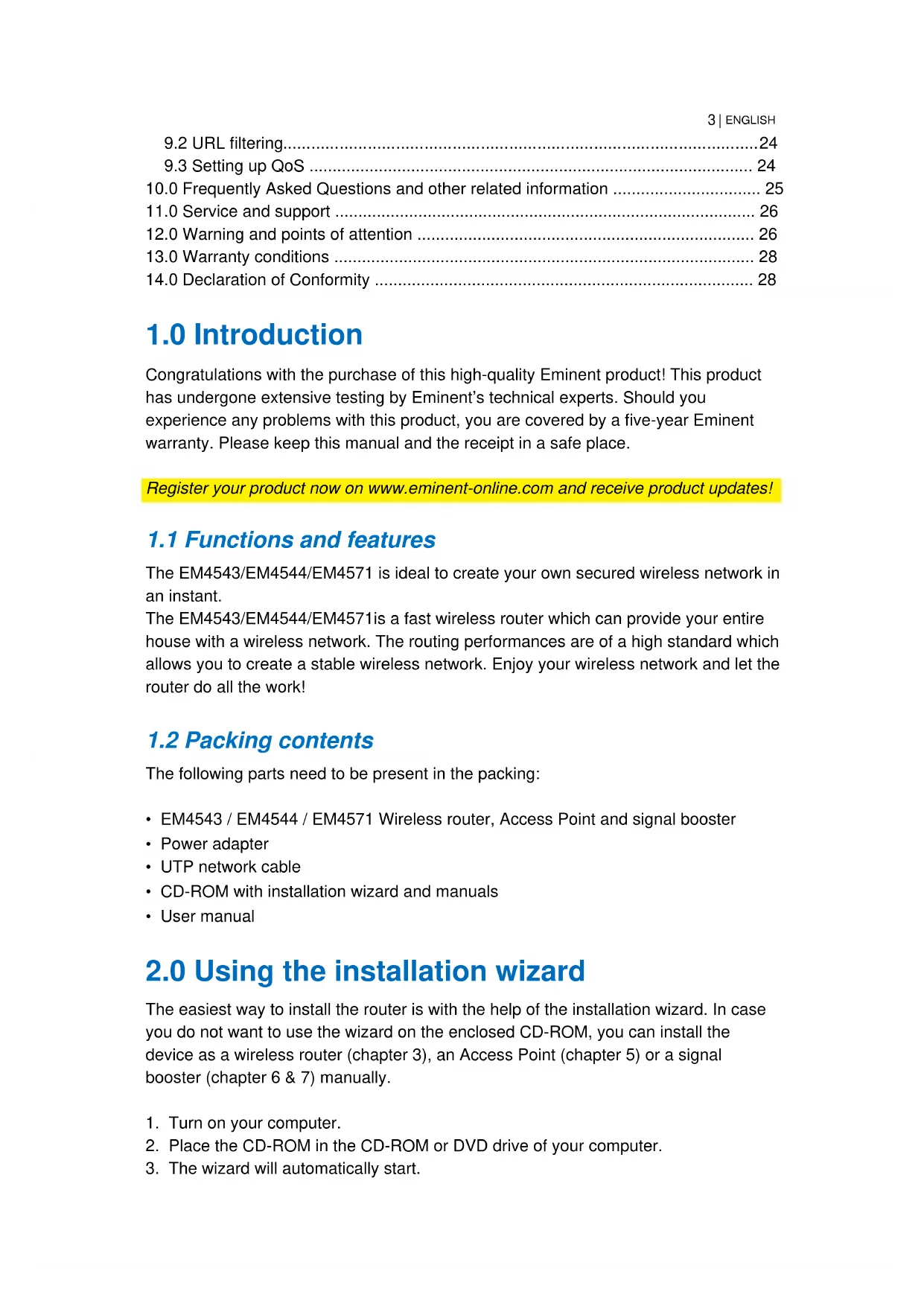 The five-year Eminent warranty applies to all Eminent products unless mentioned otherwise before or during the moment of purchase. When having bought a second- hand Eminent product the remaining period of warranty is measured from the moment of purchase by the product’s first owner. The Eminent warranty applies to all Eminent products and parts inextricably connected to and/or mounted on the main product. Power supply adapters, batteries, antennas and all other products not integrated in or directly connected to the main product and/or products of which, without reasonable doubt, can be assumed that wear and tear show a different pattern than the main product are not covered by the Eminent warranty. Products are not covered by the Eminent warranty when subjected to incorrect/improper use, external influences and/or when opened by parties other than Eminent.