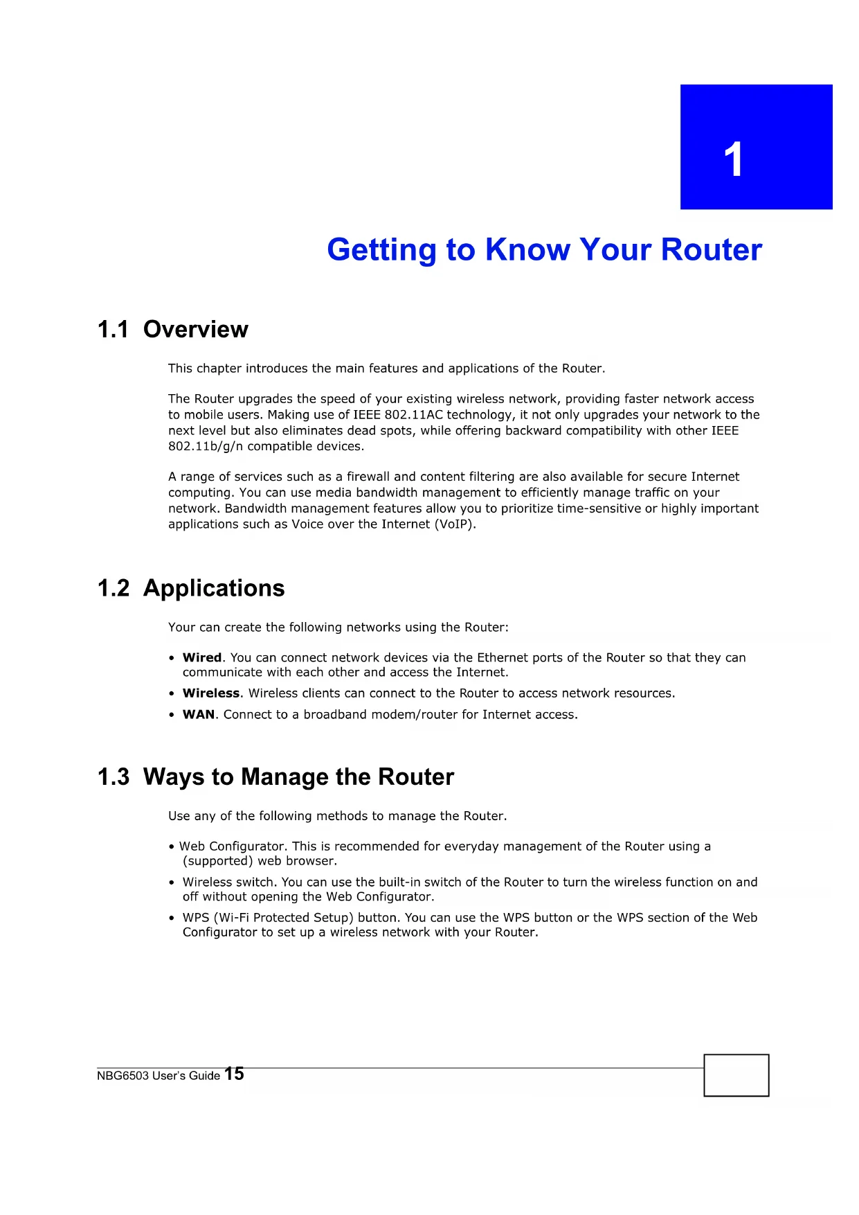 1.1 Overview This chapter introduces the main features and applications of the Router. The Router upgrades the speed of your existing wireless network, providing faster network access to mobile users. Making use of IEEE 802.11AC technology, it not only upgrades your network to the next level but also eliminates dead spots, while offering backward compatibility with other IEEE 802.11b/g/n compatible devices.A range of services such as a firewall and content filtering are also available for secure Internet computing. You can use media bandwidth management to efficiently manage traffic on your network. Bandwidth management features allow you to prioritize time-sensitive or highly important applications such as Voice over the Internet (VoIP). 1.2 Applications Your can create the following networks using the Router: • Wired. You can connect network devices via the Ethernet ports of the Router so that they can communicate with each other and access the Internet. • Wireless. Wireless clients can connect to the Router to access network resources.